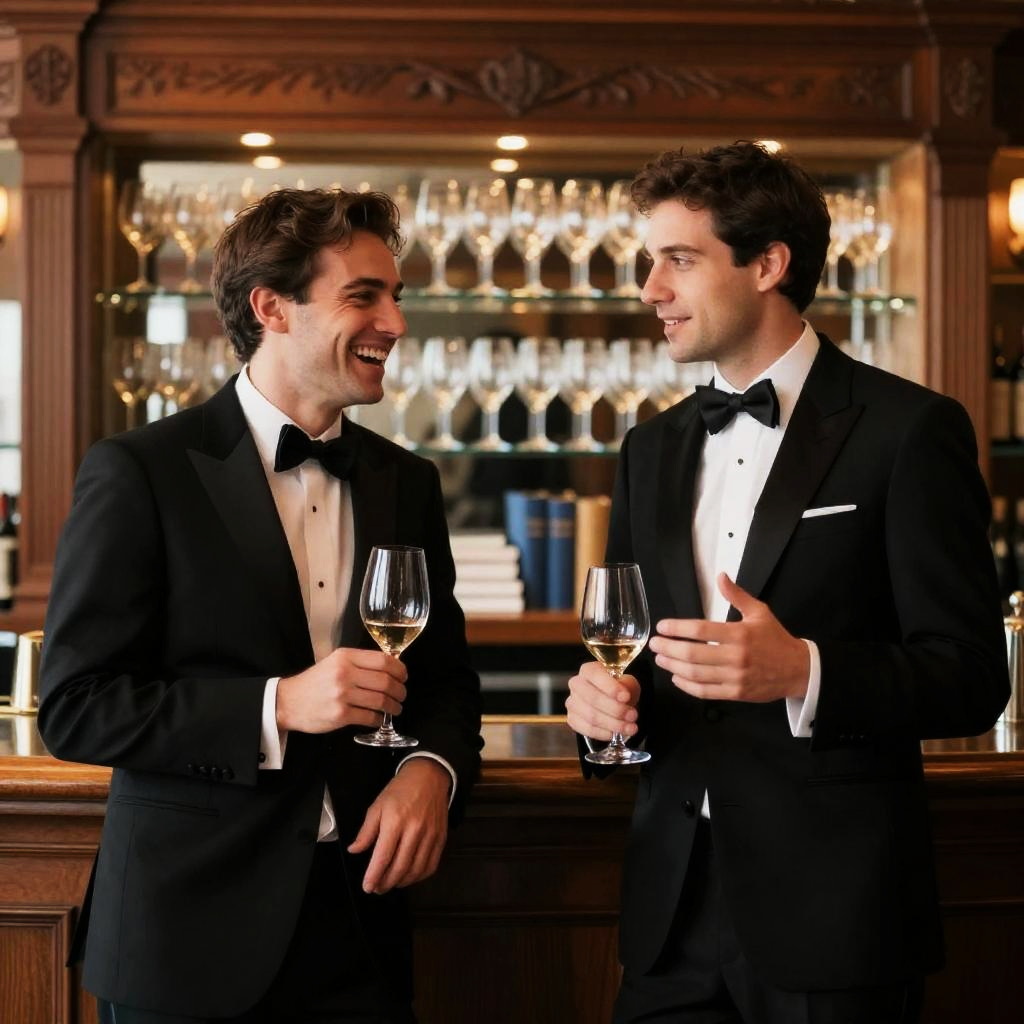 Two men standing on stone steps in front of a grand building with columns. Left man in tan suit, white shirt, brown tie, light brown hair. Right man in dark gray suit, white shirt, brown tie, sunglasses, dark brown hair. Both looking at each other, right man smiling. Background includes statues and greenery.