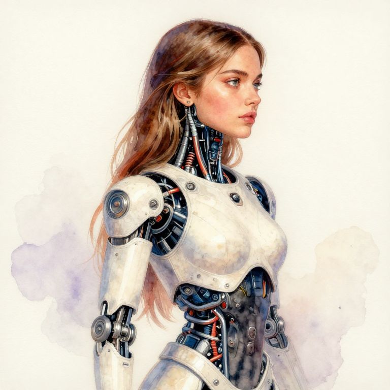 Digital artwork of a beautiful, cybernetic woman with long brown hair, white armor, and exposed mechanical joints, gazing forward.