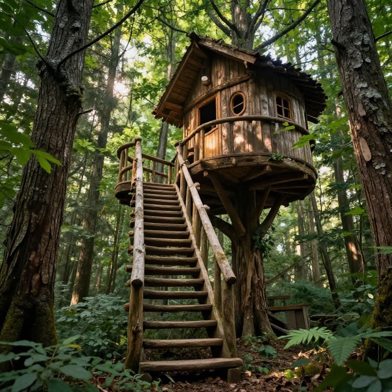Photograph of a rustic wooden treehouse nestled in a dense forest. The treehouse, elevated on sturdy branches, features a small, gabled roof and several round windows. A weathered wooden staircase with uneven steps ascends to the entrance. Sunlight filters through the lush green foliage, casting dappled shadows on the treehouse and forest floor. The forest is dense with tall trees and underbrush, creating a serene, secluded atmosphere. The texture of the wooden treehouse and staircase contrasts with the smooth, green leaves and rough tree bark.