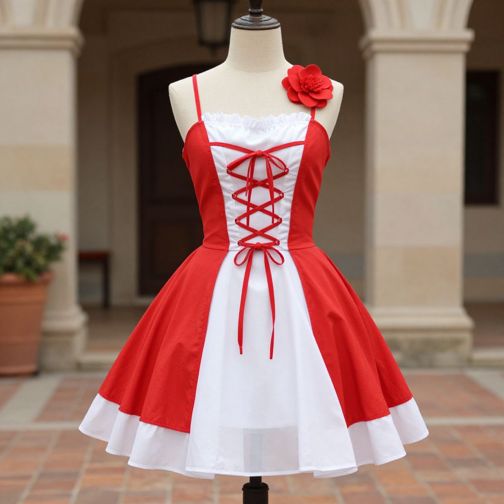 French can can dancer costume, dressed in a red and white dress and a red flower