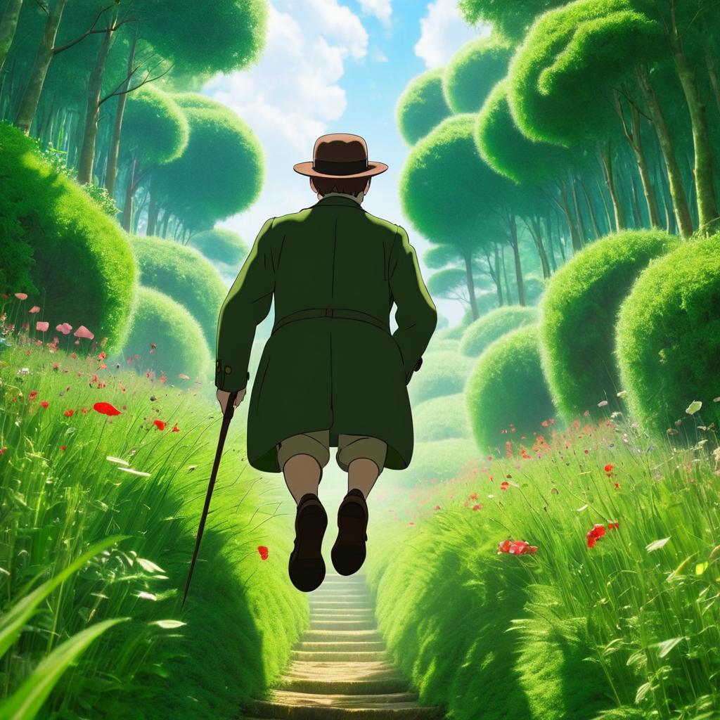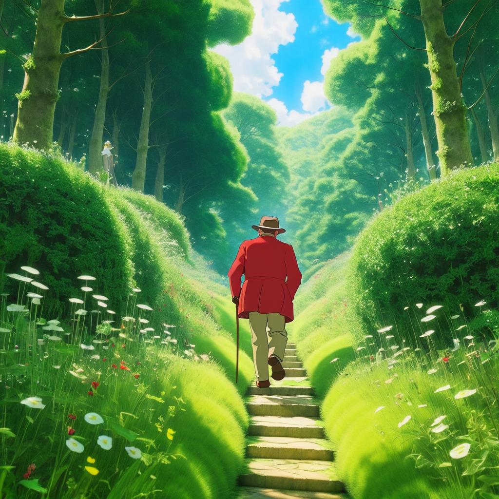 An animated-style image depicting a man resembling Winston Churchill walking up stone steps along a lush green meadow path surrounded by dense trees and flowers, inspired by Studio Ghibli's art style from The Secret World of Arrietty. The man wears a red coat, beige pants, brown shoes, and a brown hat, and uses a walking cane. Bright blue sky with soft clouds is visible above the verdant landscape.
