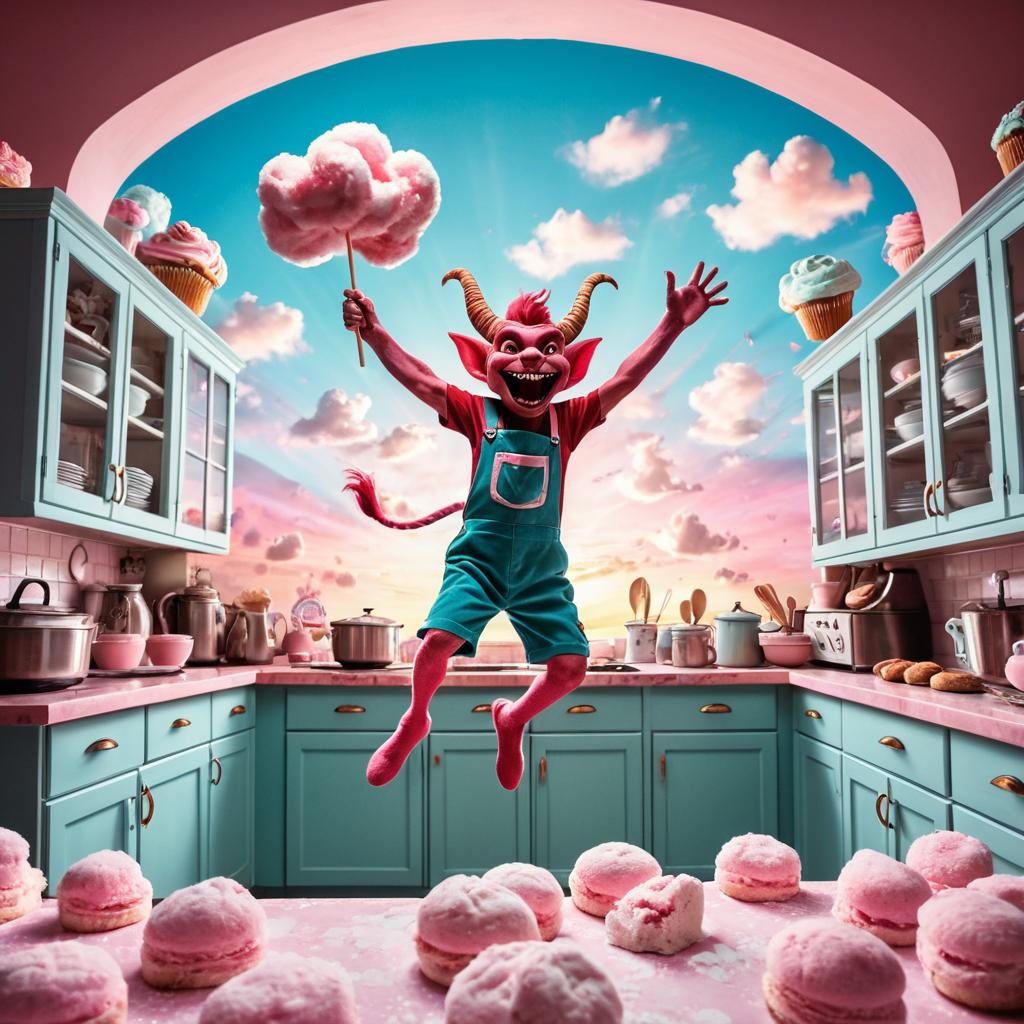 A whimsical imp baker with pink and white horns and a mischievous expression jumps in a pastel-colored kitchen surrounded by cotton candy clouds. The vibrant kitchen features turquoise cabinets, kitchen tools, and shelves filled with baking items. The scene is illuminated by a soft pastel sunrise light, creating a magical and enchanting atmosphere with fantasy and cheerful vibes.