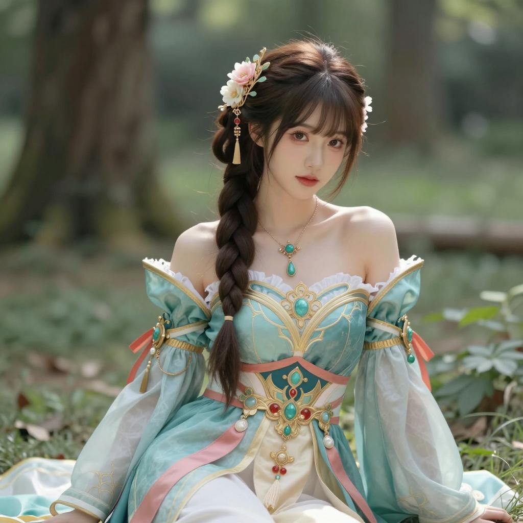 Portrait of a young Asian woman with long black hair standing under a bright full moon at night. She wears an elegant white dress with blue intricate patterns and a red belt, complemented by delicate jewelry featuring red gems. The scene includes a starry night sky with purple and blue clouds, creating a magical and serene atmosphere.