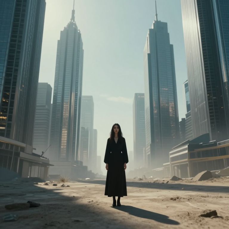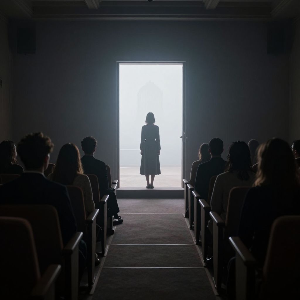 Silent figures gather in a dimly lit auditorium, their backs turned as they face a solitary woman standing before a glowing doorway that reveals a distant, ethereal structure shrouded in mist.