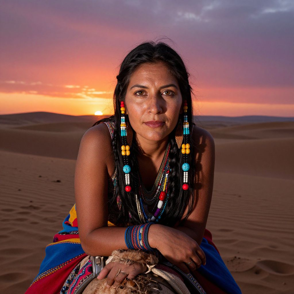 Photograph of a dark-haired, middle-aged Indigenous woman with tan skin, sitting in a desert at sunset. She wears colorful beaded necklaces and bracelets, and a traditional, vibrant dress with intricate patterns. Her black braids hang over her shoulders. She gazes directly at the camera with a serious expression. The background features rolling sand dunes under a sky painted with hues of orange, pink, and purple from the setting sun. Her hands rest on a camel's saddle, partially visible in the foreground. The image captures a sense of cultural heritage and natural beauty.