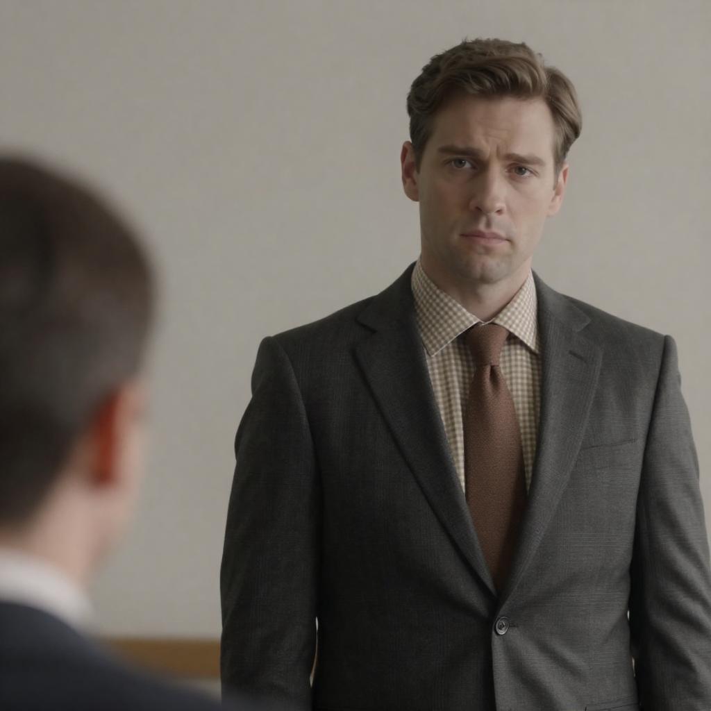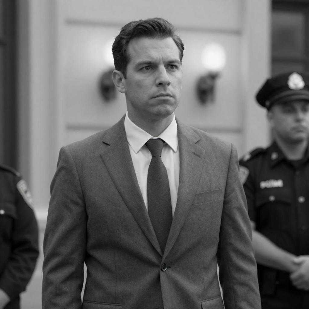 Black-and-white photograph of a man in a ured gray suit and tie, short dark hair, serious expression, standing slightly left. Background includes blurred wall sconces and a uniformed police officer on the right.