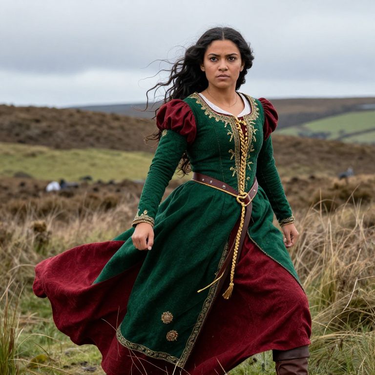 A detailed realistic photograph of Merida, with a sharp, determined face and strong jawline, wearing a majestic brave dress in rich emerald green and deep crimson, complete with golden braiding and embroidered warrior motifs, standing in battle-ready posture at the edge of a wild Scottish moor, the wind lifting the fabric around her, highlighting her courage and strength