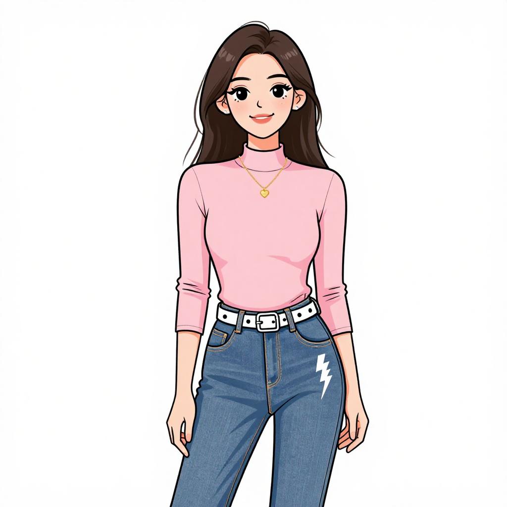 Digital drawing of a young woman with long, straight brown hair and fair skin. She has large, expressive brown eyes and a slight smile. She wears a light pink, long-sleeved turtleneck sweater, and high-waisted blue jeans with a white belt. The jeans have a small white lightning bolt design on the right thigh. She accessorizes with a gold necklace featuring a small pendant. The background is plain white, emphasizing her casual, stylish outfit. The art style is colorful and semi-realistic with clean lines and slight shading.