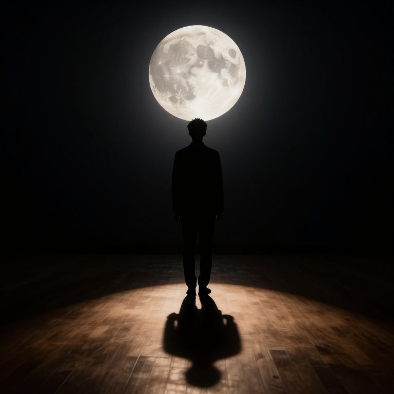 Silhouetted figure stands below a luminous moon, casting a radiant shadow on the floor as its glow illuminates the darkened room.