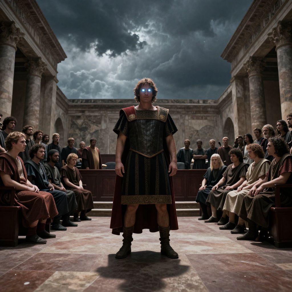 A cinematic portrayal of the Ides event, featuring a tense moment in the Senate, with a prominent figure standing dramatically at the center, glowing eyes and sharp shadows enhancing the tension, Roman architecture framing the scene under a stormy sky.