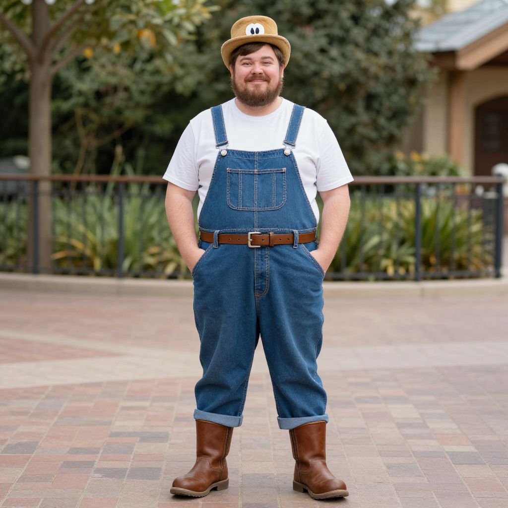 Man plus size disney happy, male focus, 1boy, facial hair, overalls, hat, hands in pockets, beard, brown footwear, full body, belt, mustache, solo, standing, looking at viewer, boots