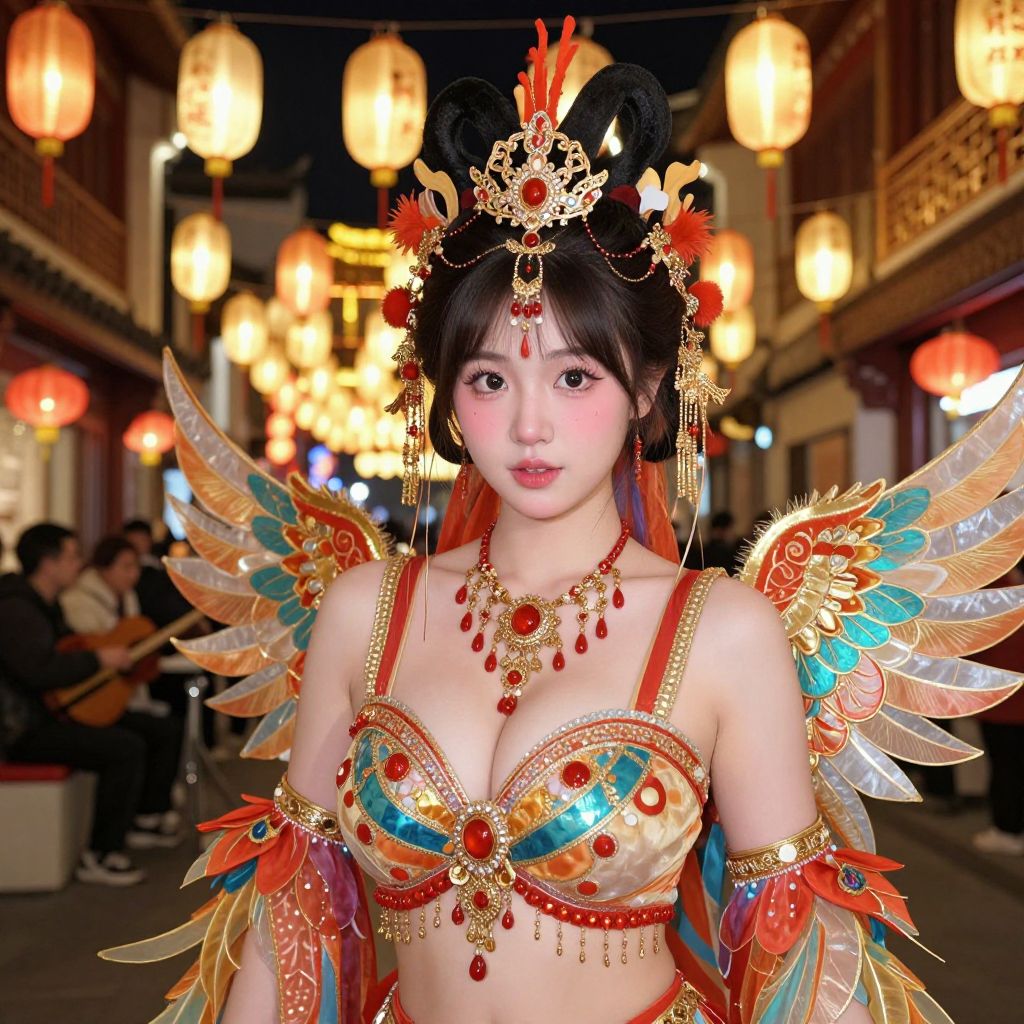 Photograph of an East Asian woman with fair skin, dressed in an elaborate, colorful traditional Chinese costume. She wears a golden, red, and blue bra adorned with red gemstones, matching armlets, and a headpiece with red and gold ornaments. Her black hair is styled in an updo with red and gold accents. She has large, feathered wings with red, blue, and gold hues. The background is a nighttime street scene with glowing paper lanterns and blurred figures. The woman's expression is neutral, and her makeup is subtle. The scene is vibrant and festive.