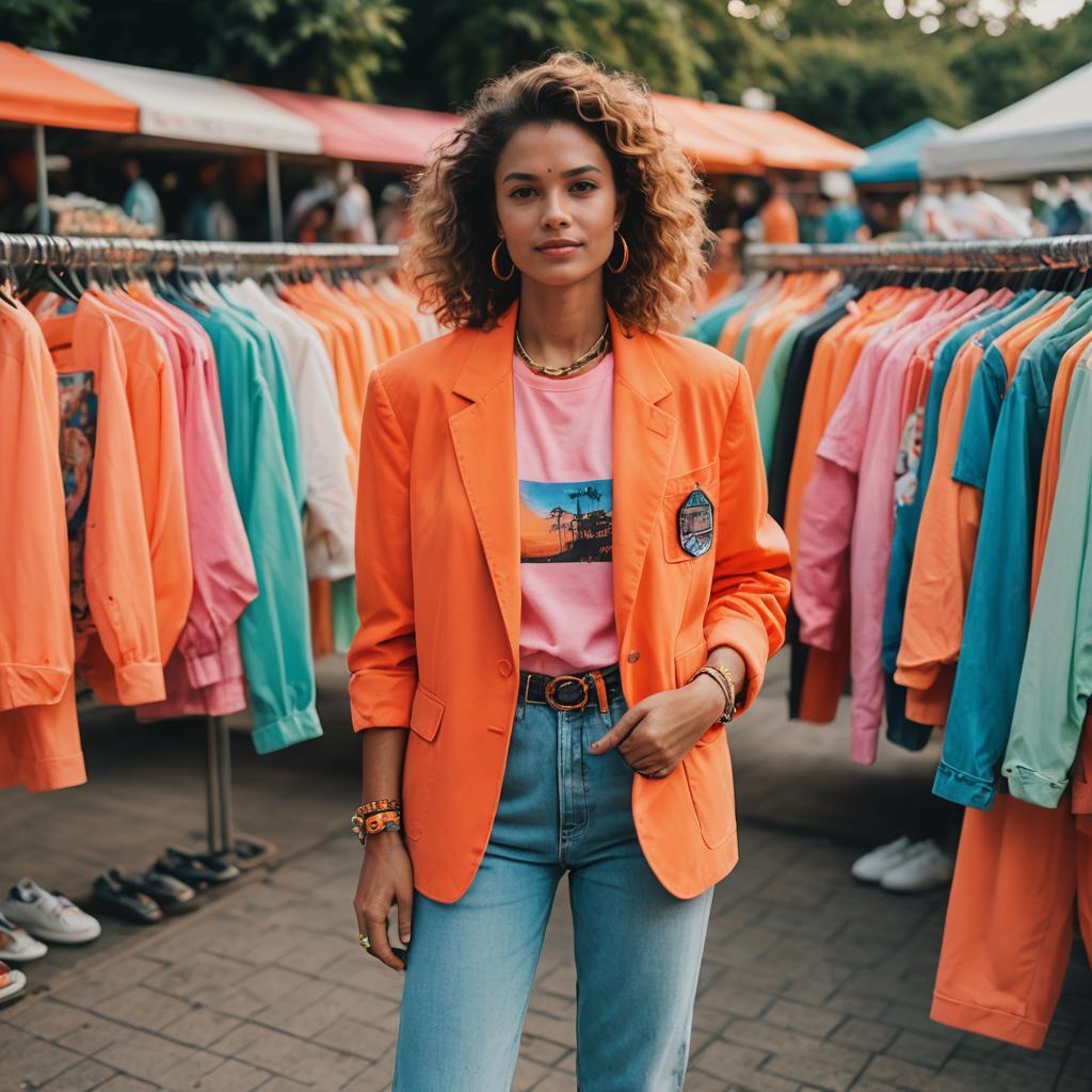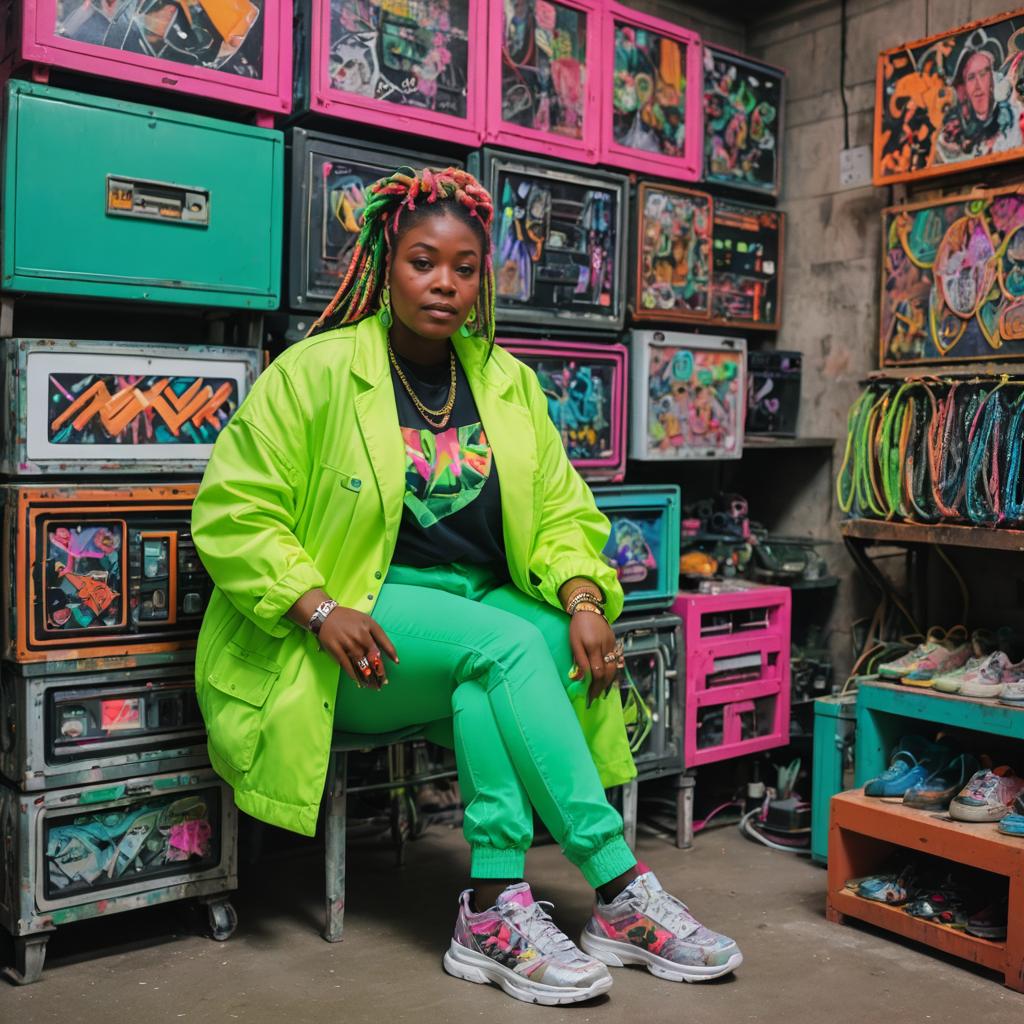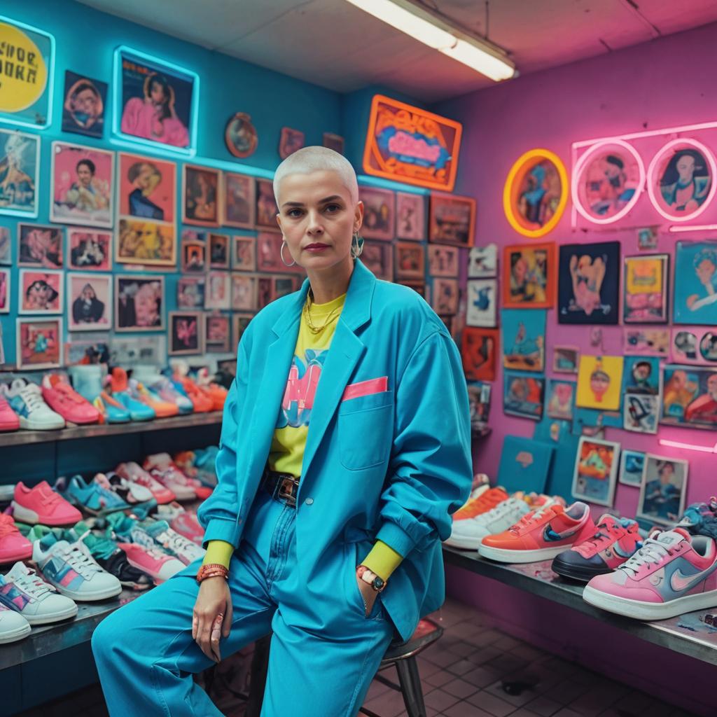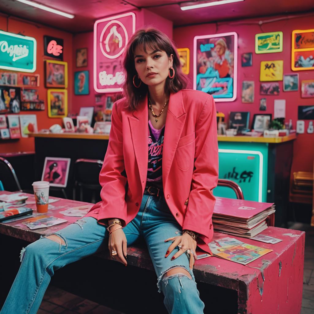 Slim blonde woman wearing an oversized crimson blazer with shoulder pads, black turtleneck, mint green acid-wash distressed jeans, and bright pink high-top ankle boots, seated at a neon-lit corner cafe with vibrant colorful walls and retro decor.