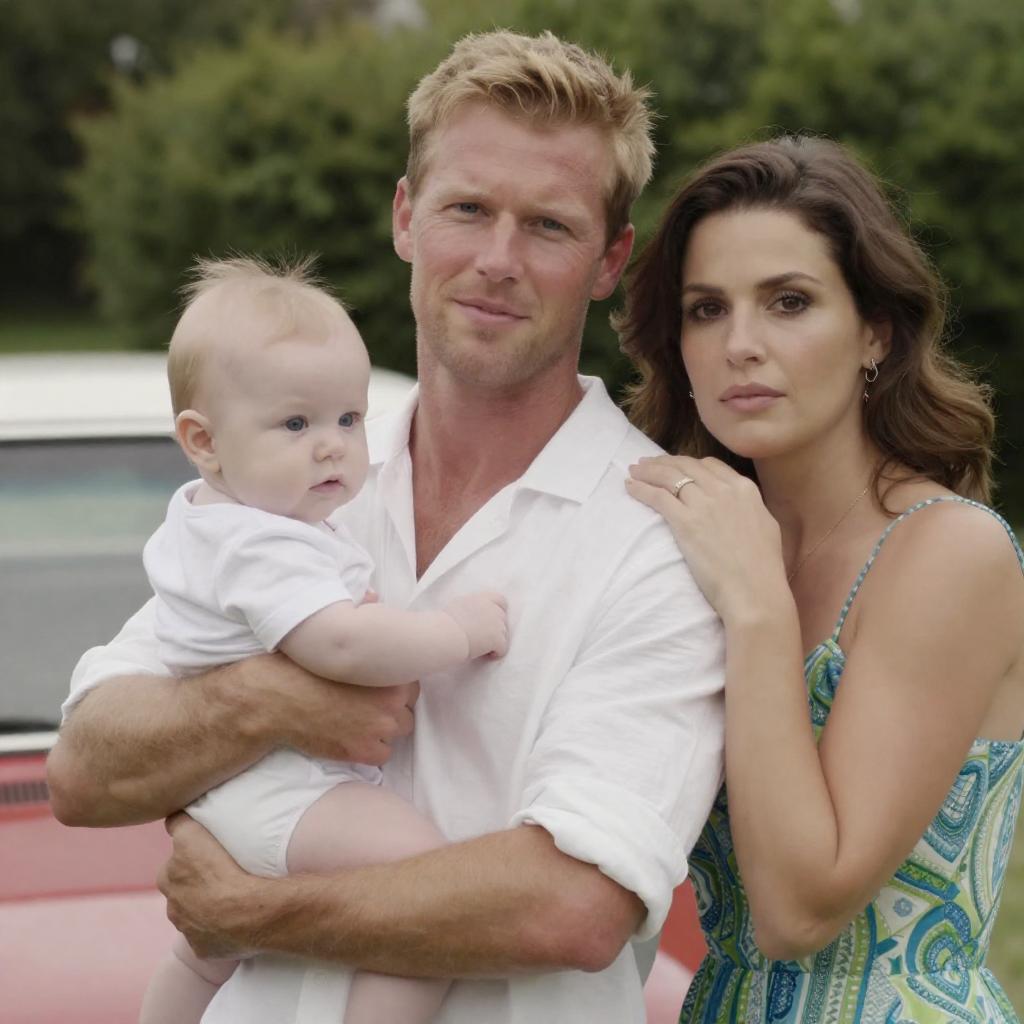 Photograph of a family. Blonde man with white shirt holding baby with light hair and white outfit. Woman with brown hair in blue-green patterned dress leaning on man's shoulder. Man's tattoo on left forearm. Green bush background, red and white vehicle partially visible. Baby looking left, man and woman with serious expressions.
