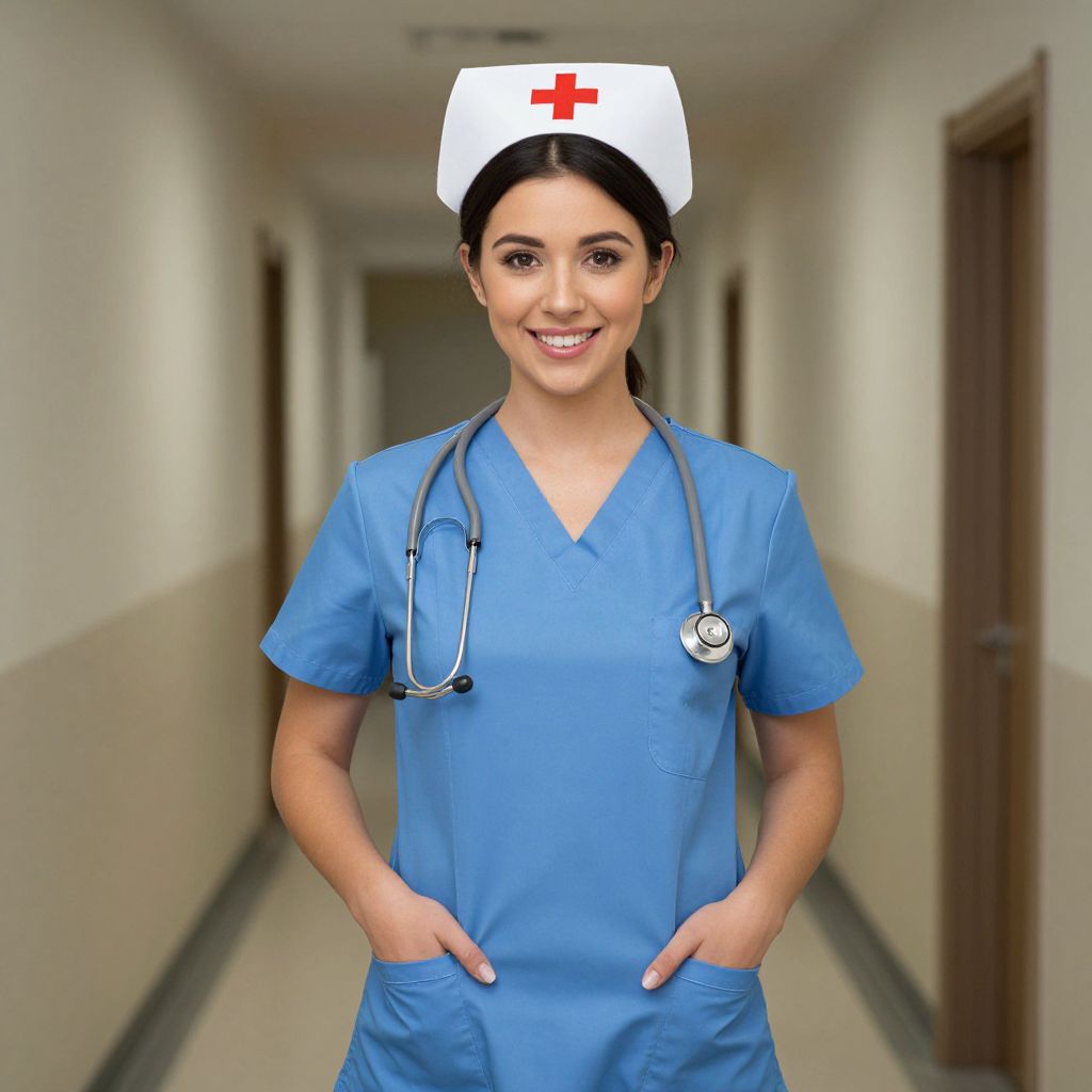 Photograph of a young woman with light olive skin and dark brown hair, wearing a white nurse's cap with a red cross, blue scrubs, and a stethoscope around her neck. She stands confidently in a brightly lit, narrow hospital hallway with white walls and wooden doors on either side. Her hands are in the pockets of her scrub top, and she smiles warmly at the camera. The hallway has a slightly blurred background, emphasizing her as the focal point. The image has a slightly digital, enhanced appearance.