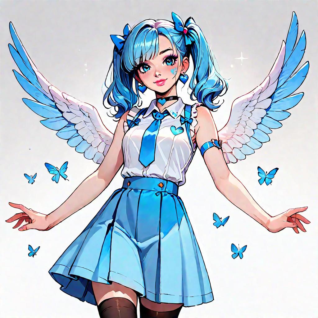 Score_9, score_8_up, score_7_up, score_6_up, score_5_up, score_4_up, source_anime, aaangel, twintails, blue hair, hair bow, blue bow, blue eyes, facial mark, heart earrings, wings, heart, choker, blue necktie, sleeveless shirt, white shirt, arm strap, blue skirt, black thighhighs, standing, cowboy shot, smile