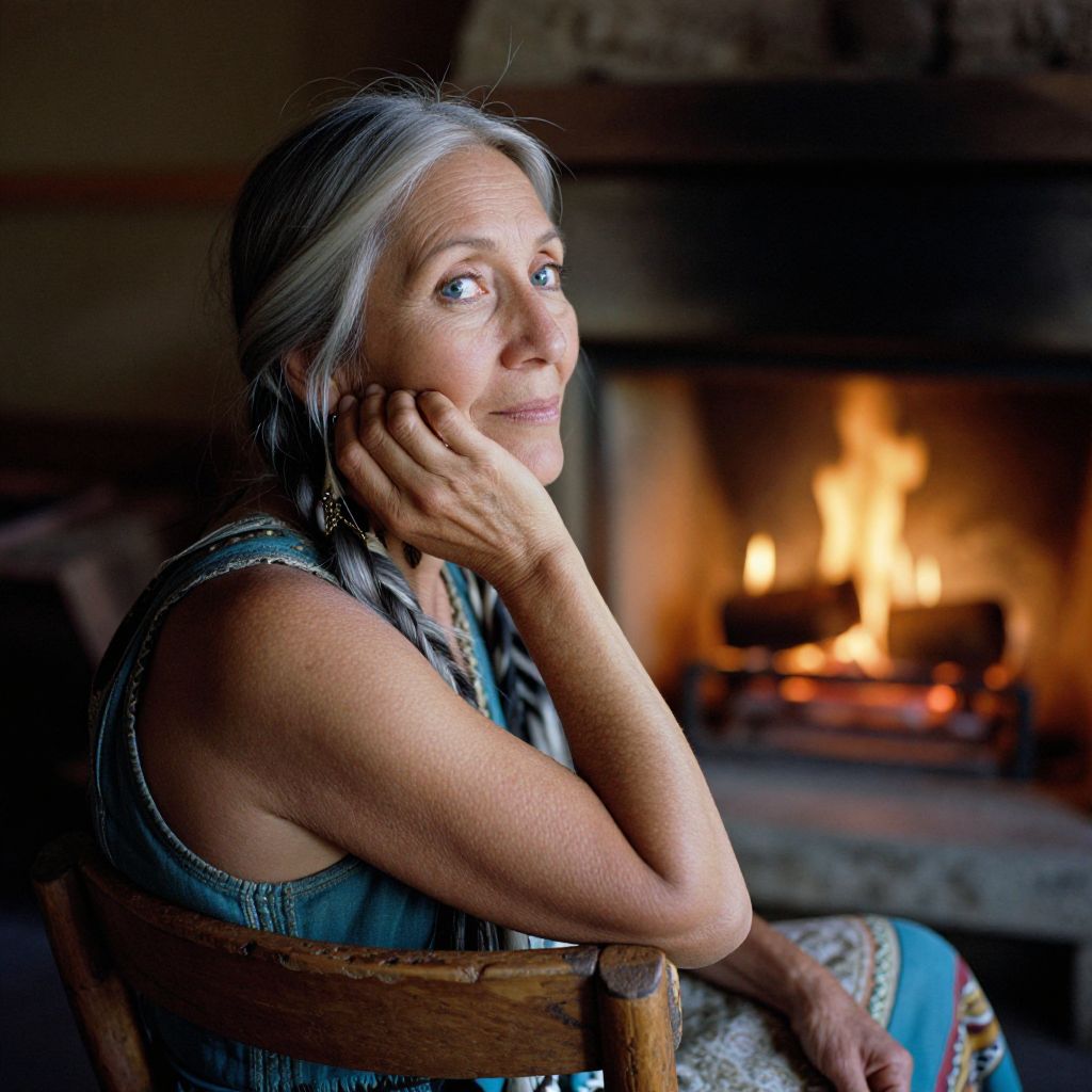 A portrait, captured with a film camera, depicts a Native American woman with striking blue eyes and flowing silver hair. The warm glow of a fireplace in the background bathes her, highlighting her thoughtful expression as she sits on a rustic wooden stool. Her introspective yet warm gaze is directed at the flickering flames, creating a unique perspective that showcases the intricate details of her ageless skin and the subtle dance of shadows and light on the soft curves of her face. This emotional gradient evokes a sense of nostalgia, serenity, and the enduring power of human connection.
