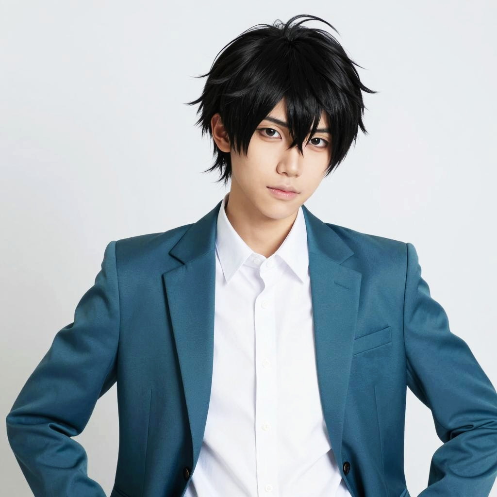 A man wearing a teal suit and white shirt poses confidently against a plain background, embodying the style of Yugo Ogami through realistic cosplay. His tousled black hair and subtle expression capture the essence of the character with a modern, polished look.