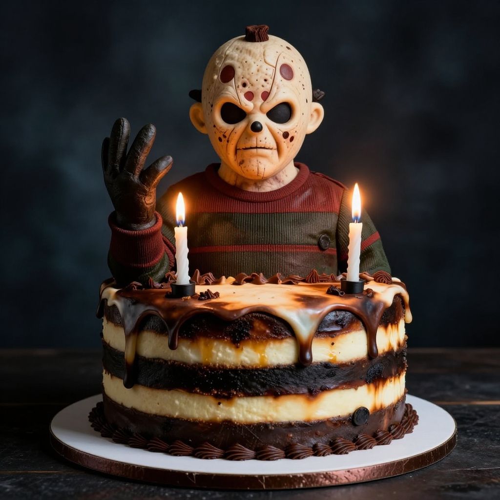 Freddy Krueger cake ideas, detailed horror-themed cake with glove fingers as candles, burnt striped layers, dark atmospheric background, photorealistic