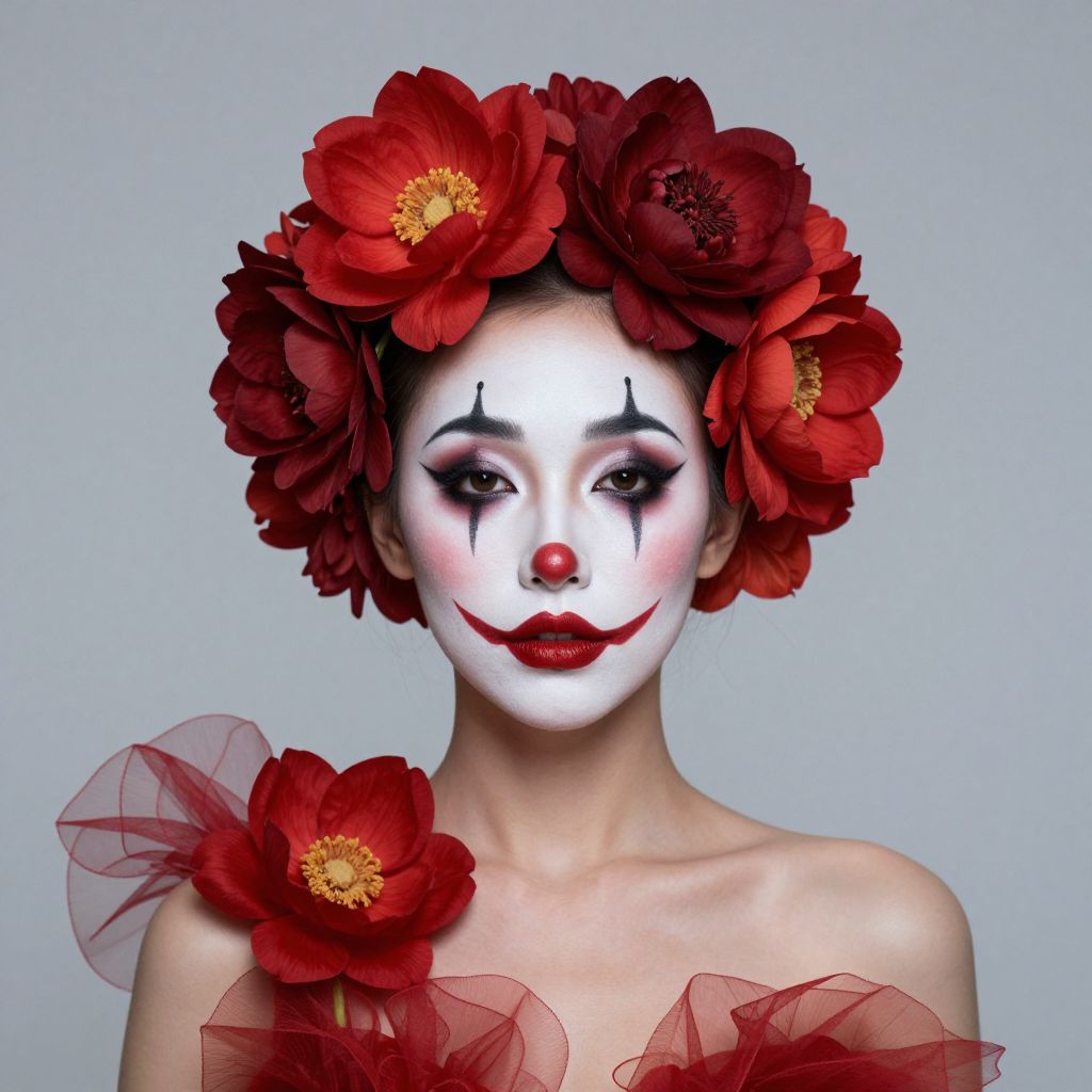A surreal portrait of a woman adorned with vibrant red flowers and elaborate makeup, featuring a whimsical blend of clown-inspired aesthetics and ethereal beauty, defying conventional norms with its dreamlike elegance.
