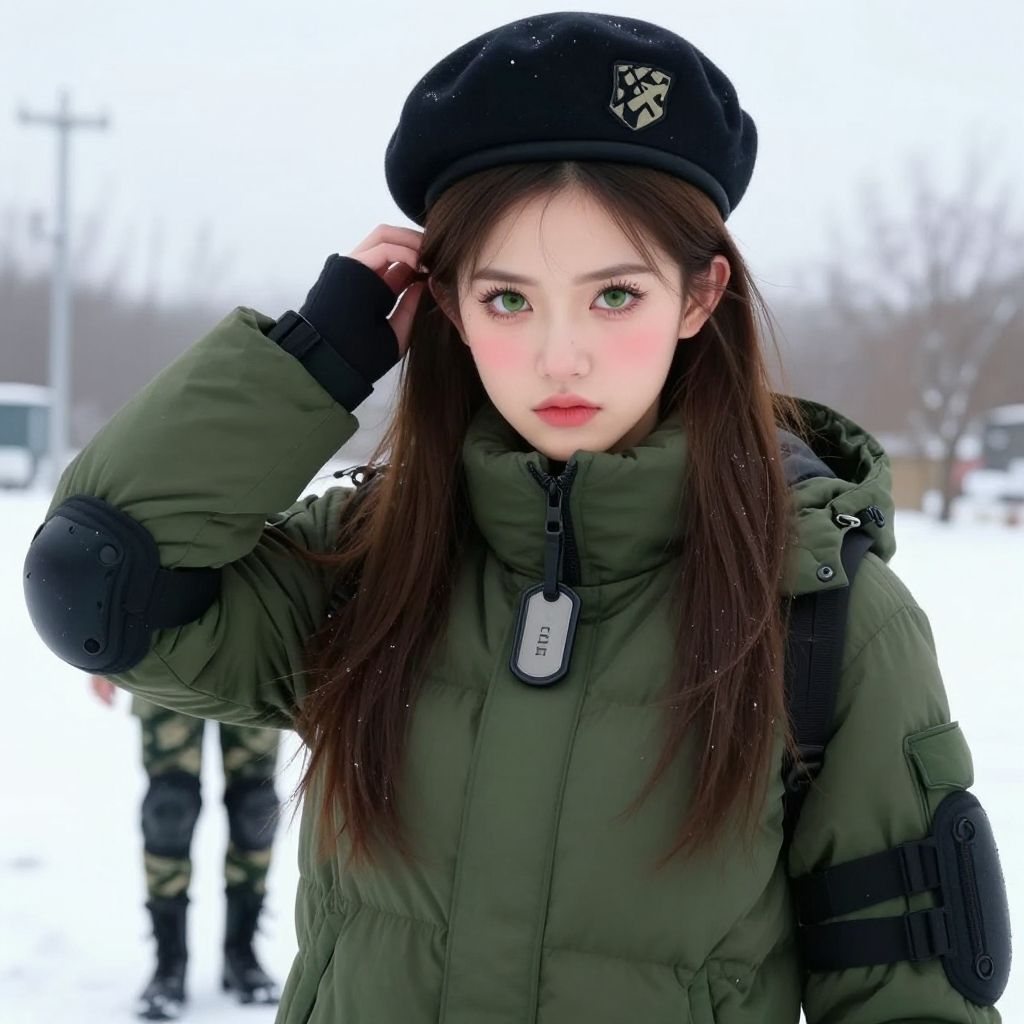 Photograph of an Asian woman with fair skin and long brown hair, wearing a black beret with a small emblem, an olive green puffer jacket, and black gloves. She has large, expressive green eyes and is adjusting her hat with her right hand. She wears a dog tag necklace and has a black backpack strap over her right shoulder. The background is a snowy, outdoor setting with blurred figures of two soldiers in camouflage uniforms. The overall image has a soft, slightly overexposed look, emphasizing the woman's face and winter attire.