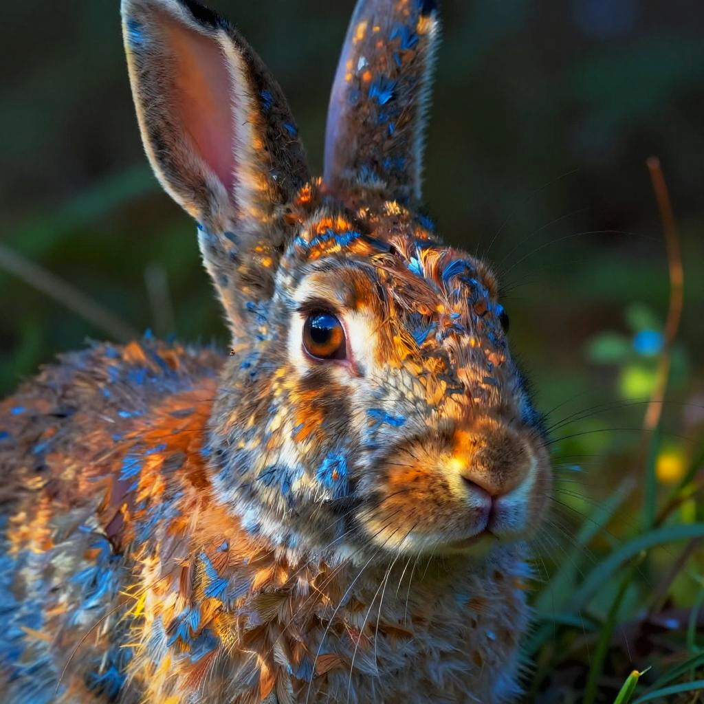Surreal portrait of a rabbit's face, with dappled sunlight and forest undergrowth seamlessly blending into her features. The face is rendered in a textured style, with intricate brushstrokes capturing both the softness of human expression and the rawness of natural elements. Warm hues of orange and yellow from the sunlight radiate across her face, contrasting against cooler blue and icy tones. The composition evokes a sense of peacefulness, with high detail and dynamic light, merging human beauty with the majesty of nature.