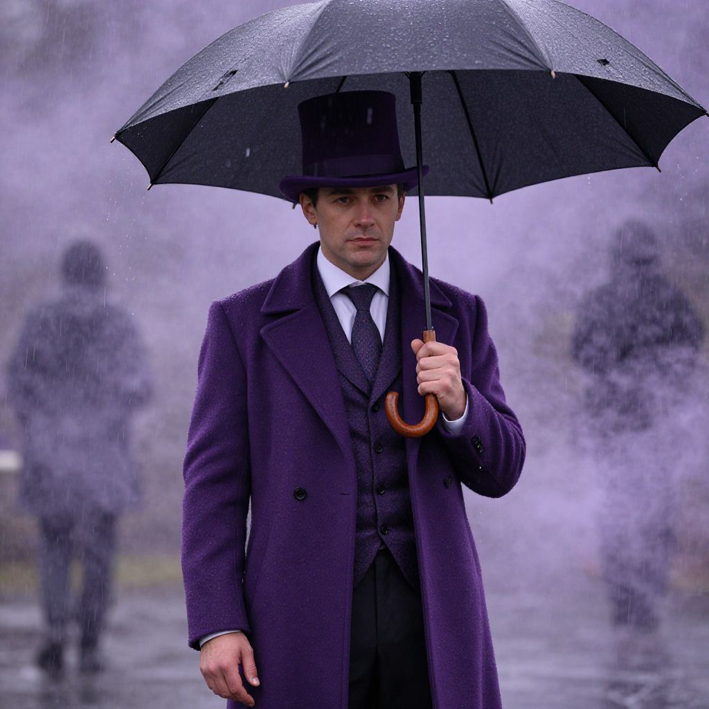 A man in a purple top hat and coat stands under a black umbrella, surrounded by purple raindrops and mist.