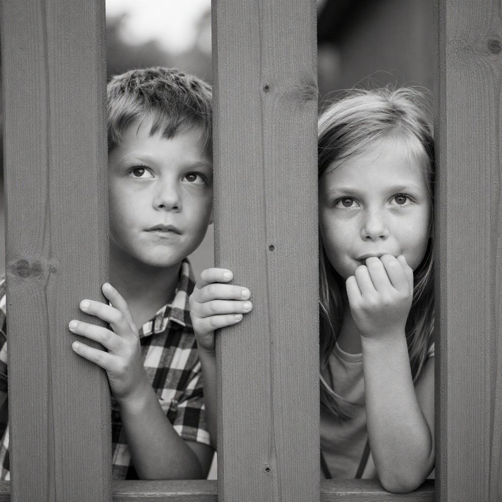 Black and white photograph of two children peeking through a wooden fence. The girl on the right, with light hair, looks curiously at the camera while chewing gum. The boy on the left, with short hair, looks upward with an expression of curiosity. The wooden fence has rough ures and cracks. Background is blurred. Both children wear checkered shirts.