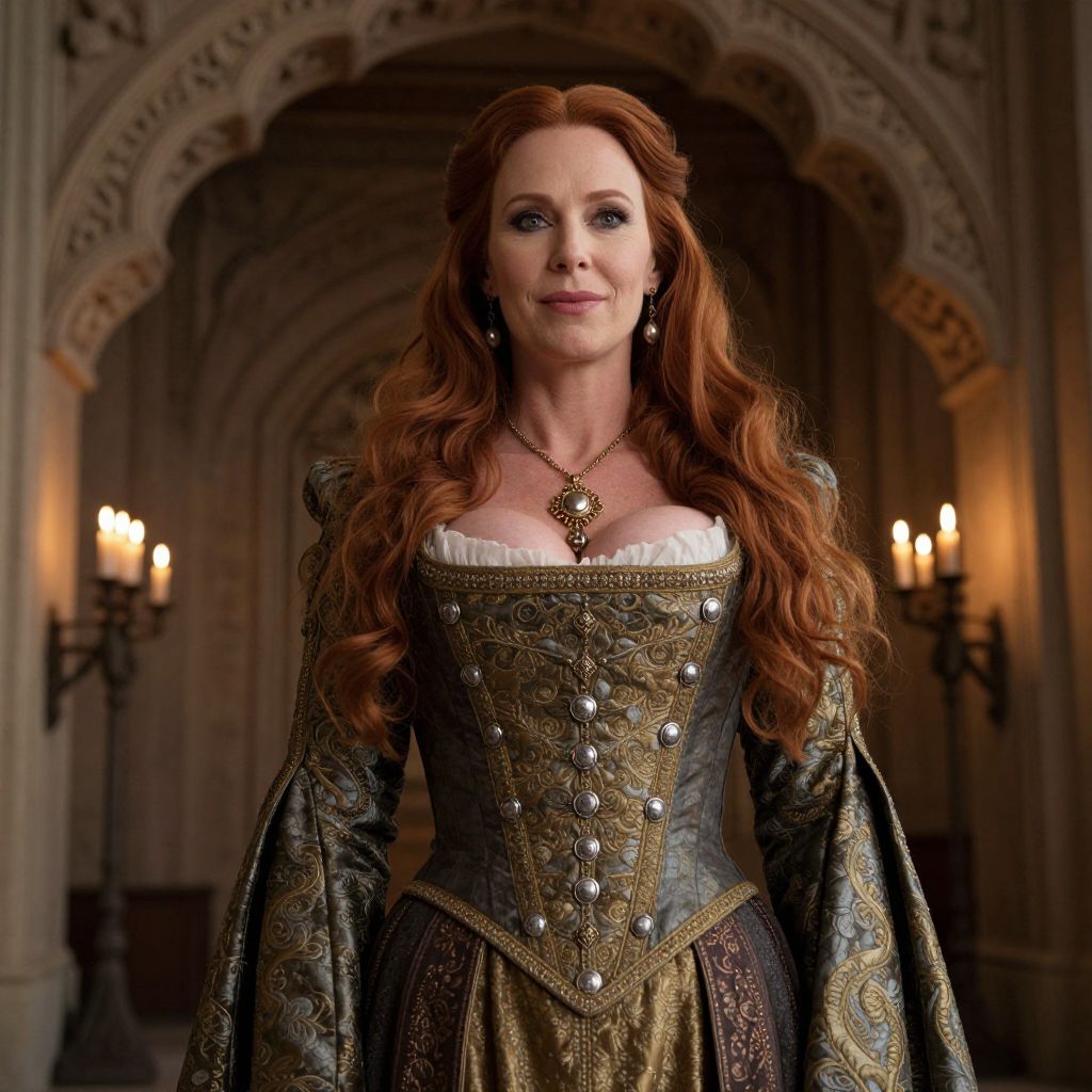 Photograph of a red-haired woman in an ornate, medieval-style gown with intricate embroidery, standing in a dimly lit, arched, go