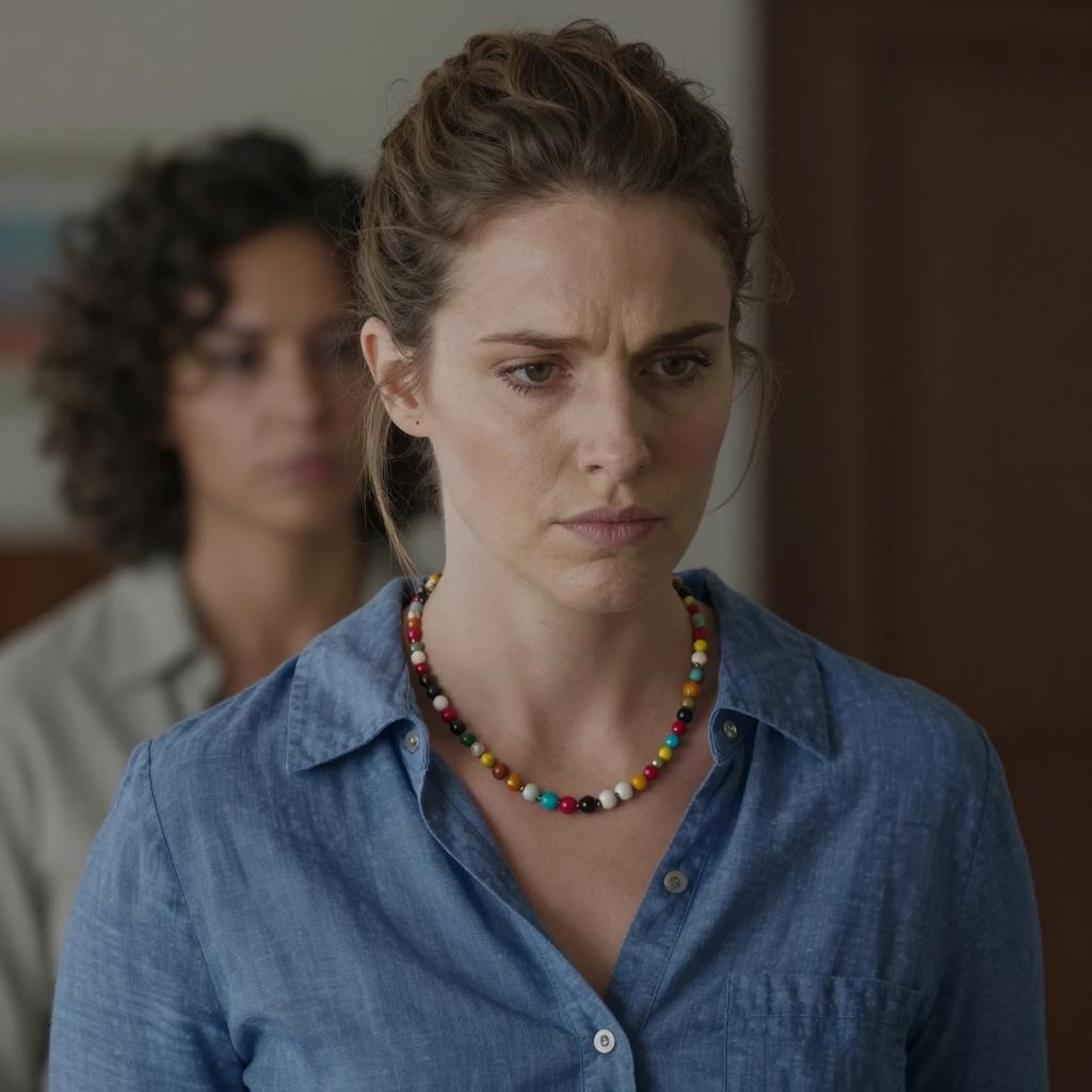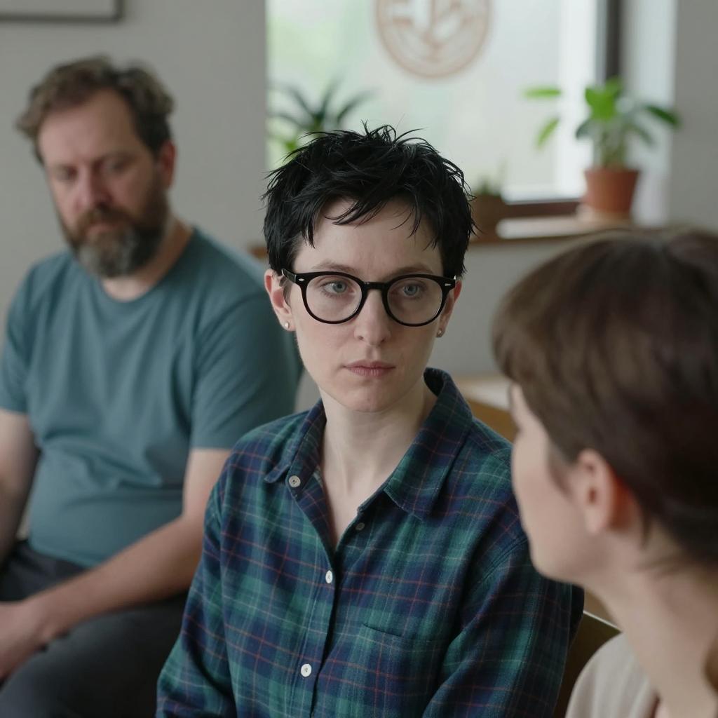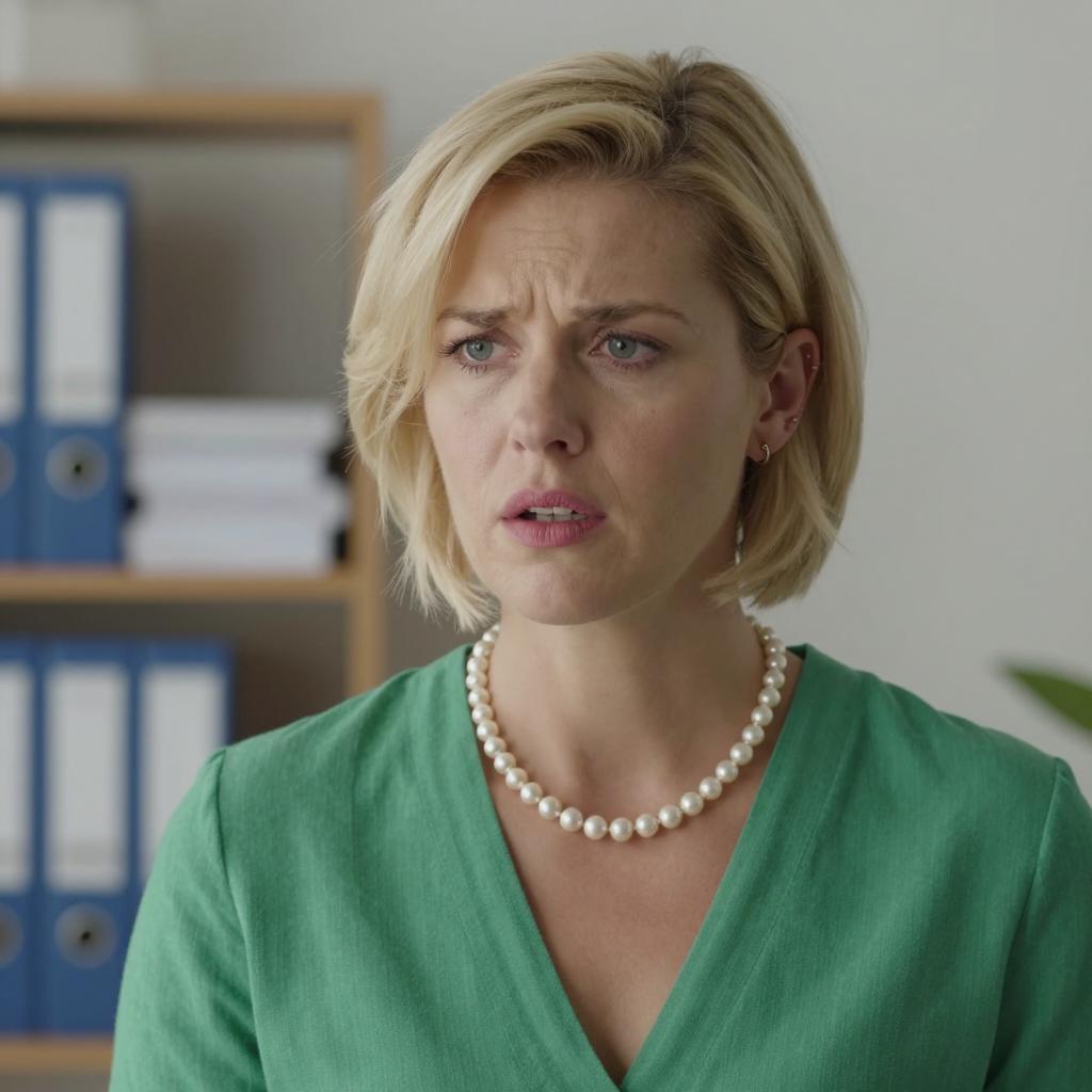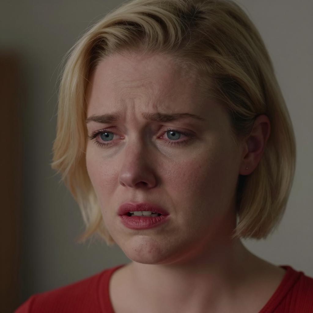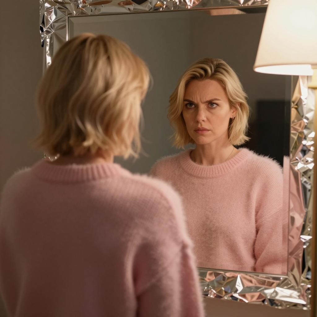 A photograph of a woman with short blonde hair, wearing glasses and a green sweater, standing at a window. She looks back over her shoulder with a slightly concerned expression. The background is dimly lit with blurred city lights visible through the window. A dark silhouette of a person is partially visible on the right.