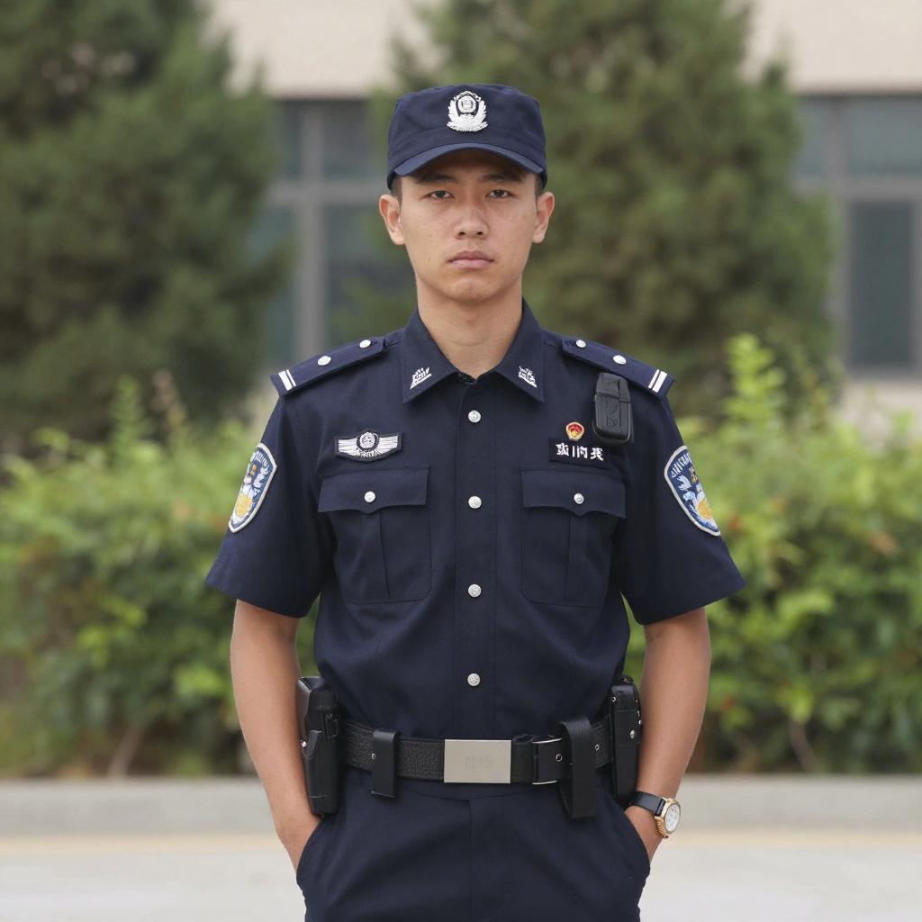 Photograph of a young Asian male police officer standing outdoors. He has a serious expression, fair skin, and short black hair. He wears a dark navy blue police uniform with short sleeves, adorned with white patches on the shoulders and chest, a name tag, and a utility belt with a radio and handcuffs. His hands are in his pockets. He also wears a matching navy blue cap with a white emblem. The background features blurred greenery and a building with large windows. The image has a sharp focus on the officer, with a shallow depth of field.