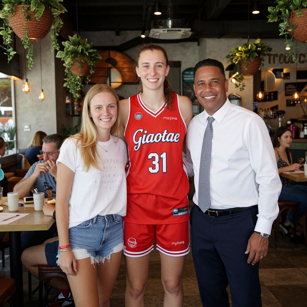 Heather, a basketball player wearing a red jersey with \"Gliaotae\" and the number 31, stands smiling between two individuals—a blonde woman in a white t-shirt and denim shorts, and a man in a white dress shirt, tie, and dark pants—inside the Tropicante restaurant, surrounded by hanging lights, potted plants, and patrons seated at tables.