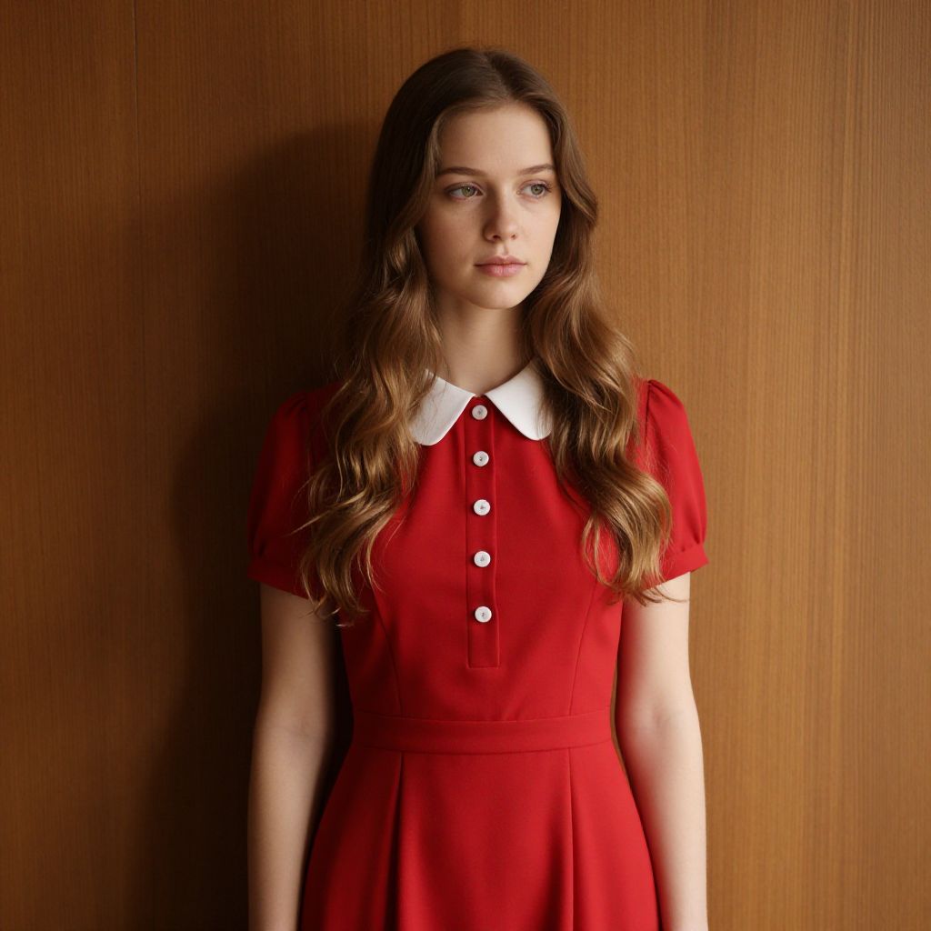 Woman with long blonde hair wearing a white shirt and a red and black dress with red accents.