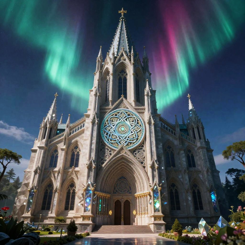 A beautiful and highly detailed digital painting of an elven cathedral in a beautiful garden in a serene valley, pastel colors, celtic, intricate geometric patterns, intricate details, epic scale, insanely complex, cgsociety, 8 k, sharp focus, hyperrealism, by alex grey, caspar friedrich, albert bierstadt, james gurney, brian froud