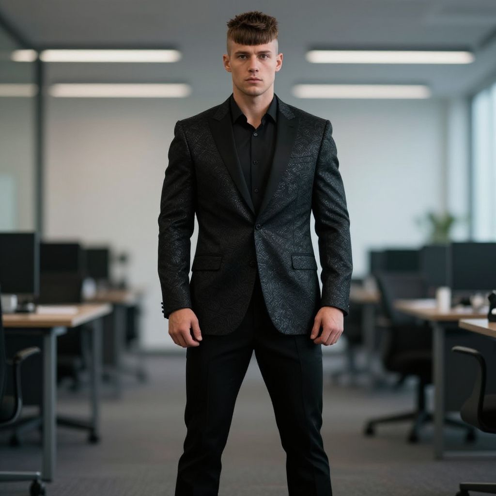 Photograph of a young Caucasian man with short, styled brown hair, standing in a modern office. He has a serious expression and is dressed in a black, textured blazer over a black button-up shirt, paired with black pants. The office background features blurred desks with monitors, black office chairs, and fluorescent lighting. The image has a sharp focus on the man, with a shallow depth of field that blurs the office environment, drawing attention to his attire and confident stance. The overall style is contemporary and professional.