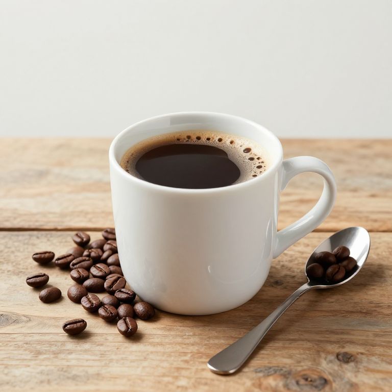 Photograph of a white ceramic coffee cup filled with black coffee, surrounded by scattered coffee beans and a silver spoon on a rustic wooden table.