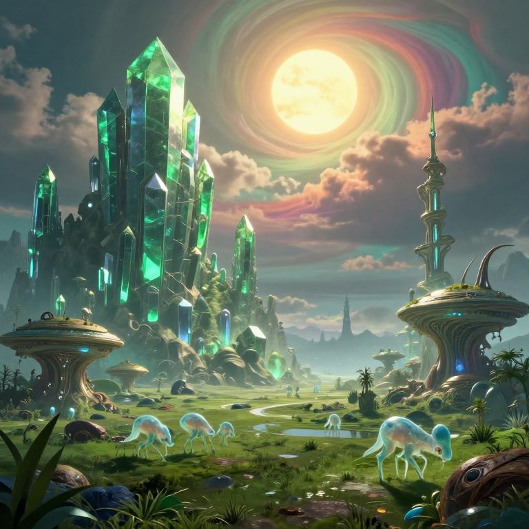 This digital fantasy artwork depicts a vibrant, otherworldly landscape under a sun with rainbow-colored rays. Dominating the scene are towering, crystalline structures with glowing green facets, standing on rocky terrain. In the foreground, luminescent white creatures resembling sheep graze on green grass. To the left and right, spherical, futuristic structures with intricate designs and glowing blue accents rise from the ground. The sky is filled with dramatic, swirling clouds, and distant, smaller crystal spires are visible. The image combines elements of sci-fi and fantasy, with rich, vivid colors and detailed textures.