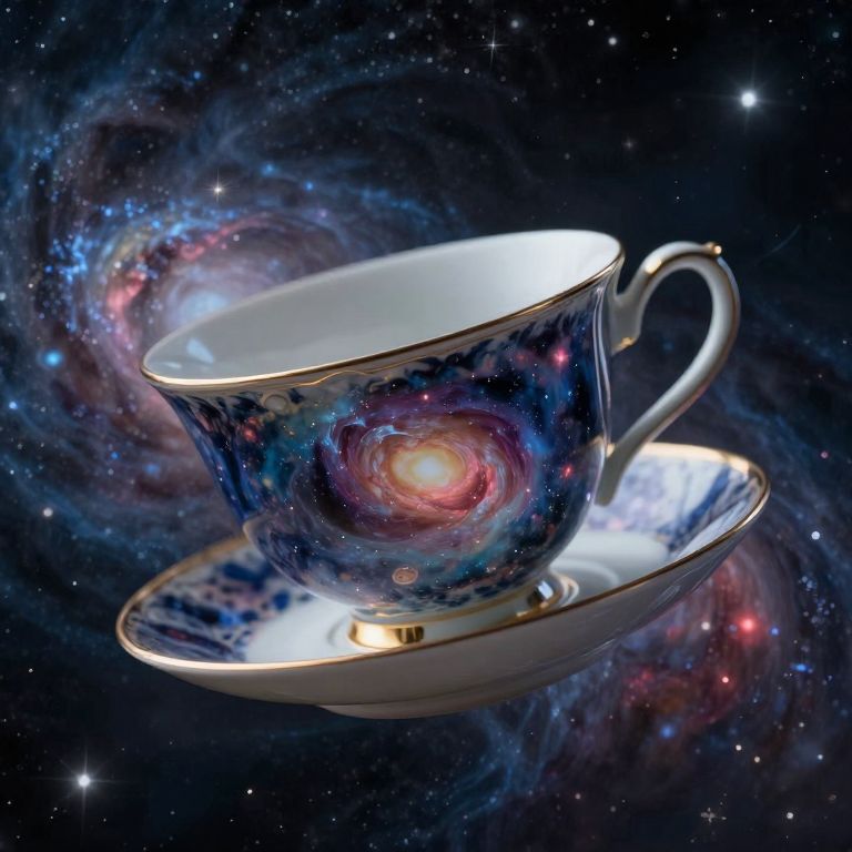 Craft an intricate digital artwork in the surrealistic style, portraying a close-up view of a fragile porcelain teacup hovering in mid-air amid an expansive, swirling cosmos. The surface of the cup gleams like celestial bodies, reflecting prismatic hues that mirror the cosmic panorama enveloping it. This enigmatic scene conveys a sense of both serenity and intrigue as it merges the ordinary object with the boundless expanse of space, inviting the viewer on a dreamlike voyage through a wonderland of imagination.