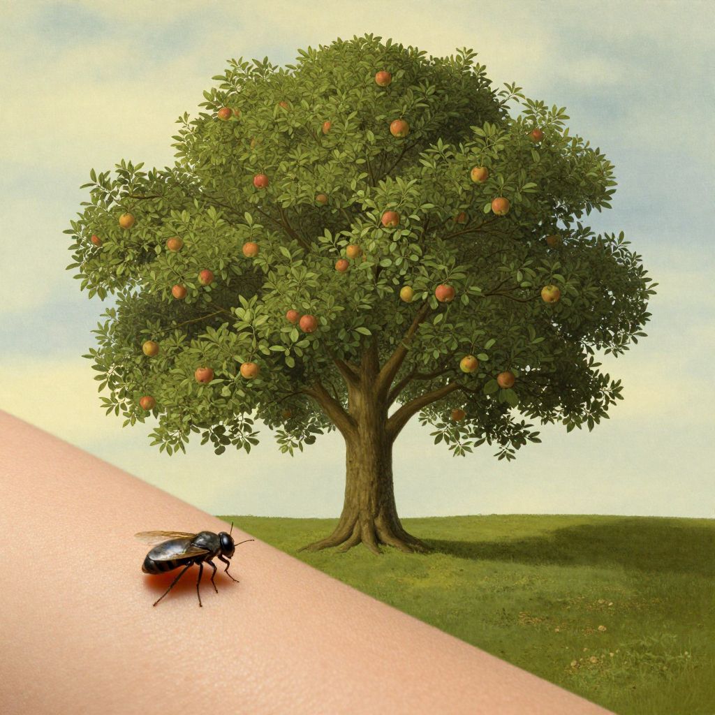Envision a surreal landscape that blurs the lines between reality and fantasy, reminiscent of Magritte's \"The Son of Man\", but viewed from an unconventional perspective - as if seen through the tiny lens of an insect resting on a human limb. In this imaginative tableau, a figure is partially concealed by a verdant apple tree that stretches across their form, creating an enigmatic portrait where subject and foliage merge into one harmonious piece. This visual conundrum evokes both curiosity and introspection, compelling the viewer to question the nature of reality and perception in this thought-provoking, hyperrealistic composition.