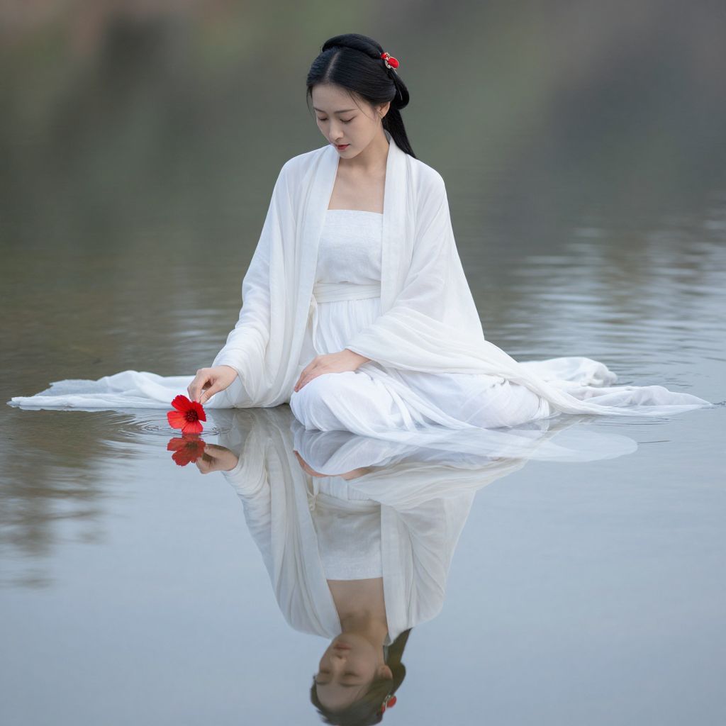 Photograph of an Asian woman with fair skin and long black hair, wearing a flowing white traditional dress and matching shawl, sitting in a calm, reflective body of water. She holds a red flower in her right hand, her eyes downcast. Her dress and shawl are soaked, creating ripples around her. The background is blurred, focusing attention on her serene, contemplative expression. The red flower contrasts sharply with her white attire and the muted water tones. The image has a soft, ethereal quality, emphasizing tranquility and simplicity.