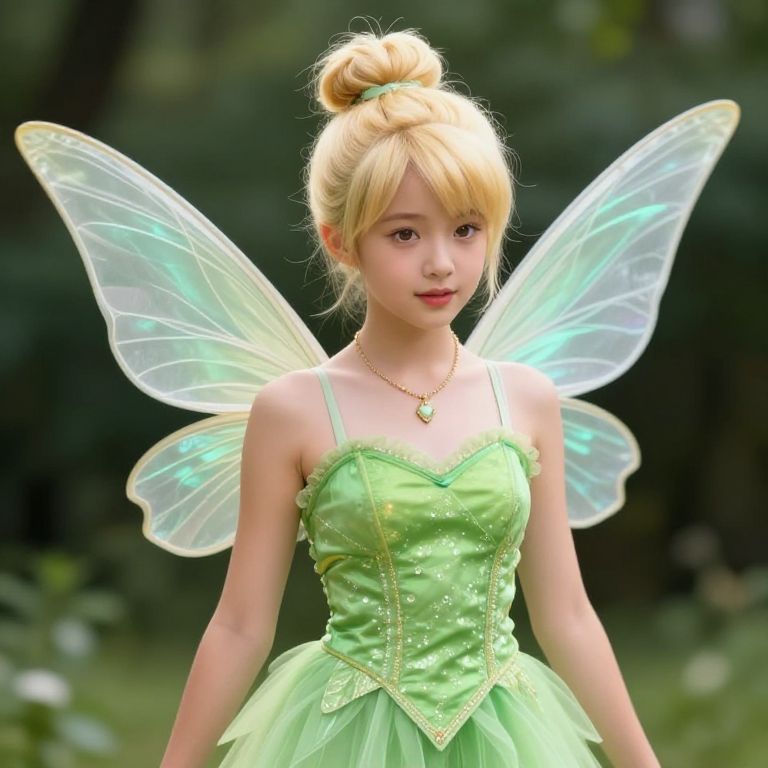 "Tinkerbell Attire, blond haired girl in green dress with fairy wings and gold necklace"