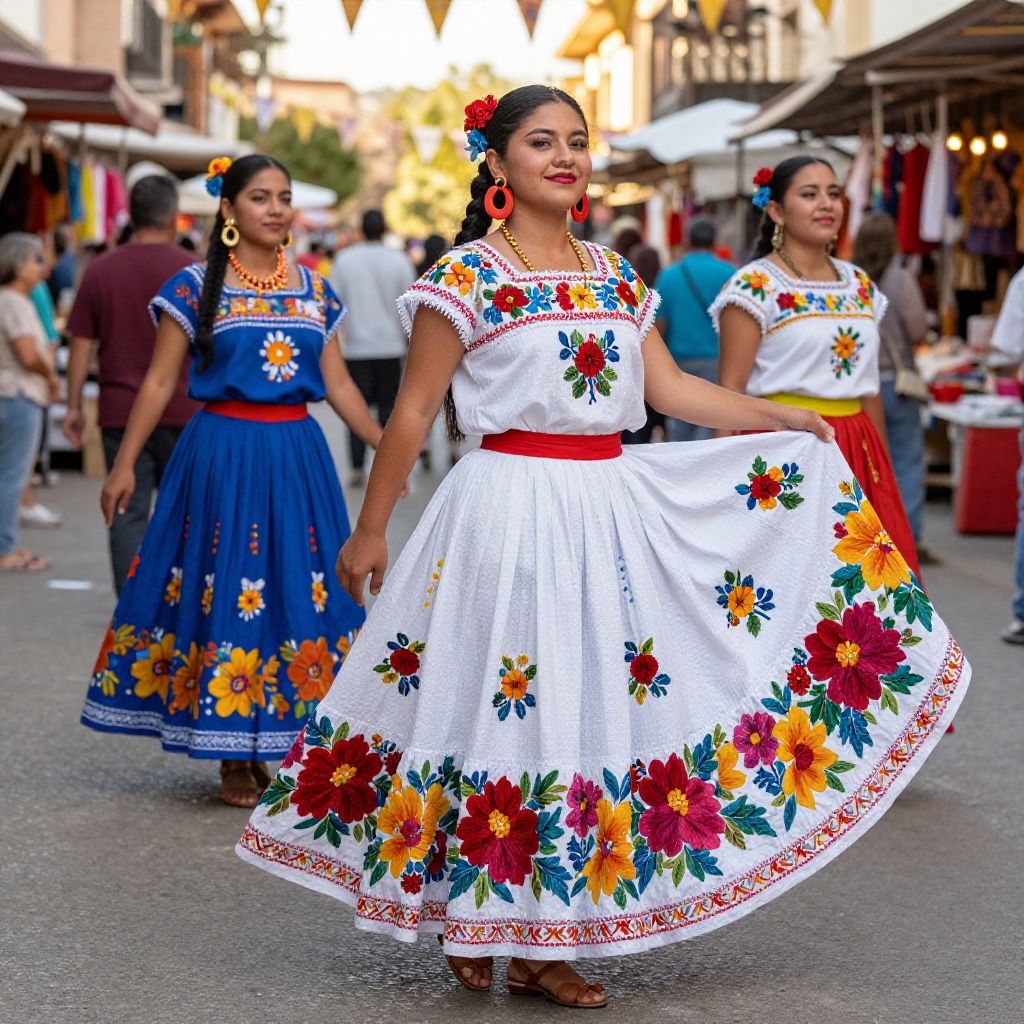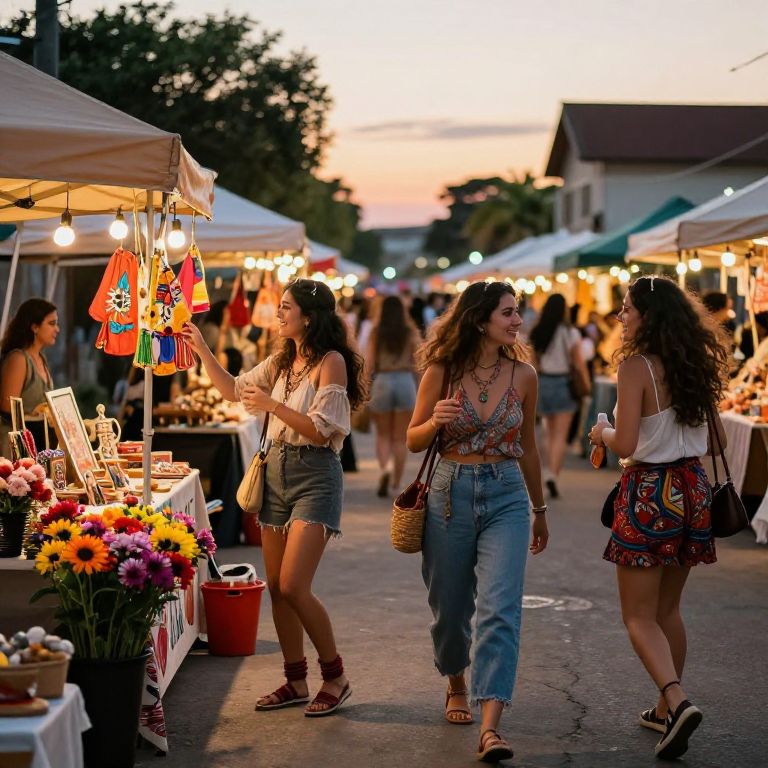 Amigas at a festive street market during sunset, colorful stalls selling flowers and handmade crafts, warm ambient lighting, lively atmosphere with string lights, casual bohemian outfits, energetic and vibrant depiction of friendship and culture.