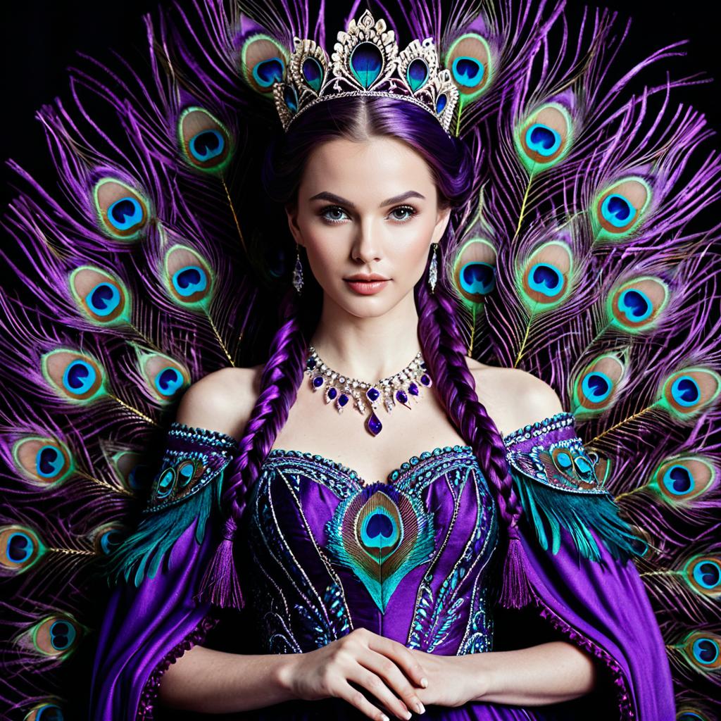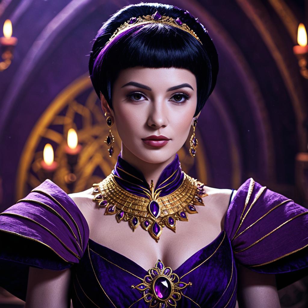 Yzma emperors groove costume, digital art, high fantasy, female character, dark short hair, purple eye makeup, elegant expression, purple and gold dress with high collar, elaborate necklace and earrings, detailed ures, rich purple color, fantasy background, medieval-inspired setting, soft lighting, character centered, portrait view, realistic style, CGI, high detail, fantasy character design