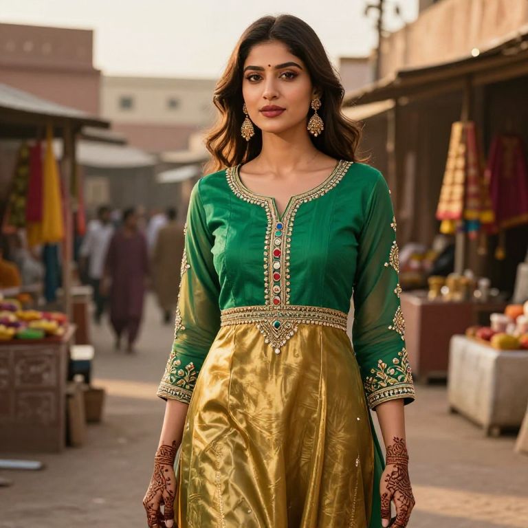 Salwar suit gemini prompt: A vibrant, modern salwar suit in rich emerald and gold, styled with intricate gemstone detailing on the sleeves and waist, set against a sun-drenched Indian marketplace at golden hour, with intricate henna patterns in the background, warm lighting, photorealistic, cinematic composition.