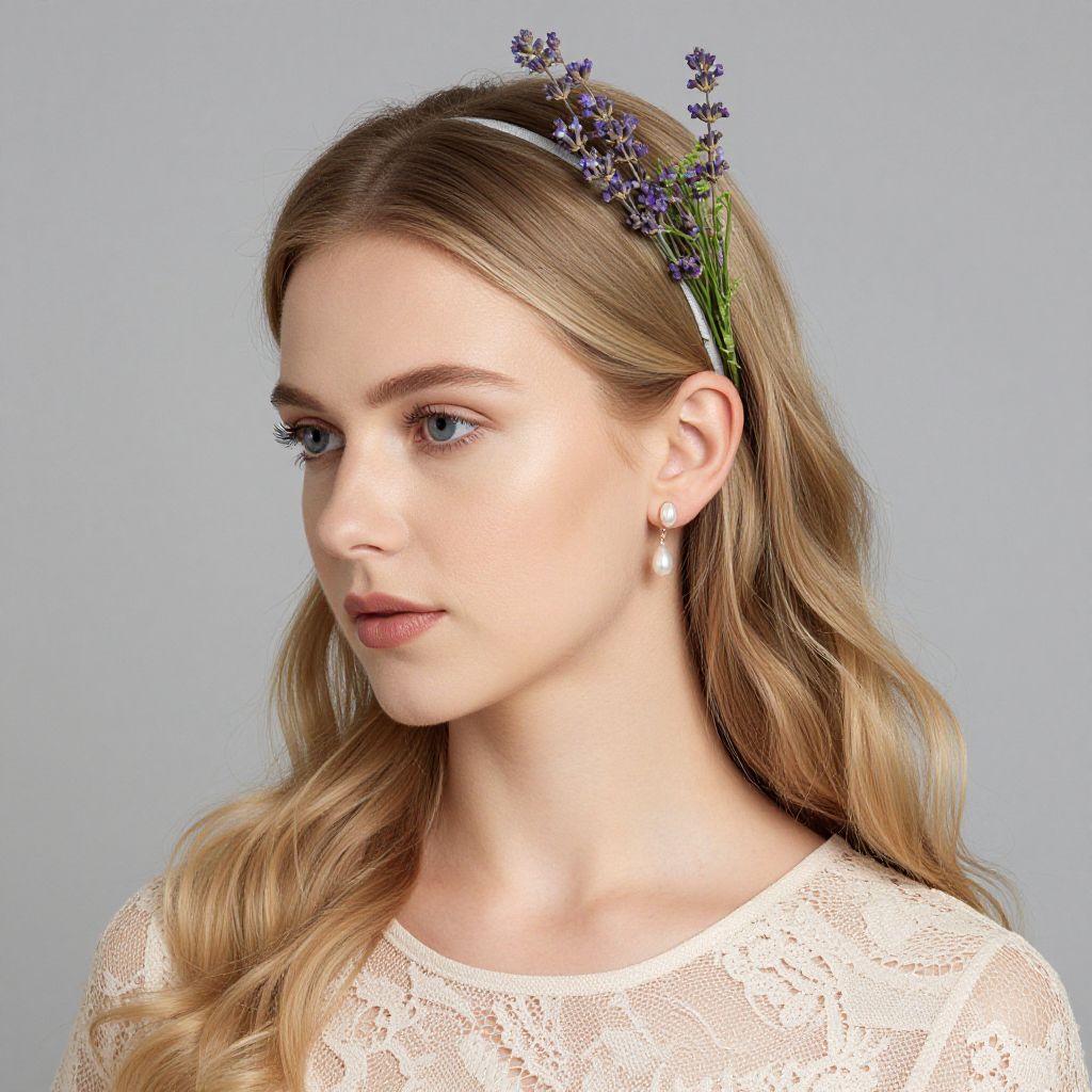 Blonde woman wearing a delicate side headband adorned with lavender flowers and green foliage, complemented by a lacey ivory top and a subtle pearl earring.
