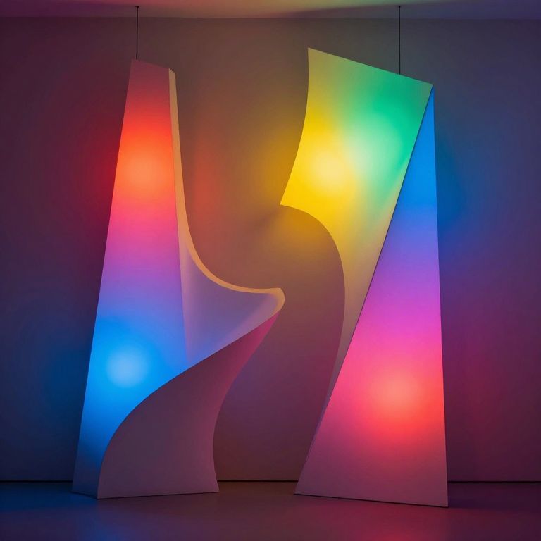 Abstract lighting fixtures in an avant-garde installation, combining sharp angles and smooth curves, intense color gradients, ambient lights casting dramatic shadows