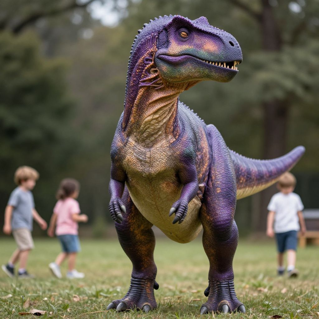 Photograph of a life-sized, colorful, realistic dinosaur statue with purple and blue scales, and a textured, scaly skin. The dinosaur has a wide, toothy grin and stands in a grassy park. In the blurred background, three children - a blonde boy in a gray shirt and beige shorts, a dark-haired girl in a pink shirt and blue shorts, and another blonde boy in a white shirt and blue shorts - are walking and playing. Tall trees with dark green foliage fill the background, creating a natural, outdoor setting. The image has a slight CGI enhancement effect.
