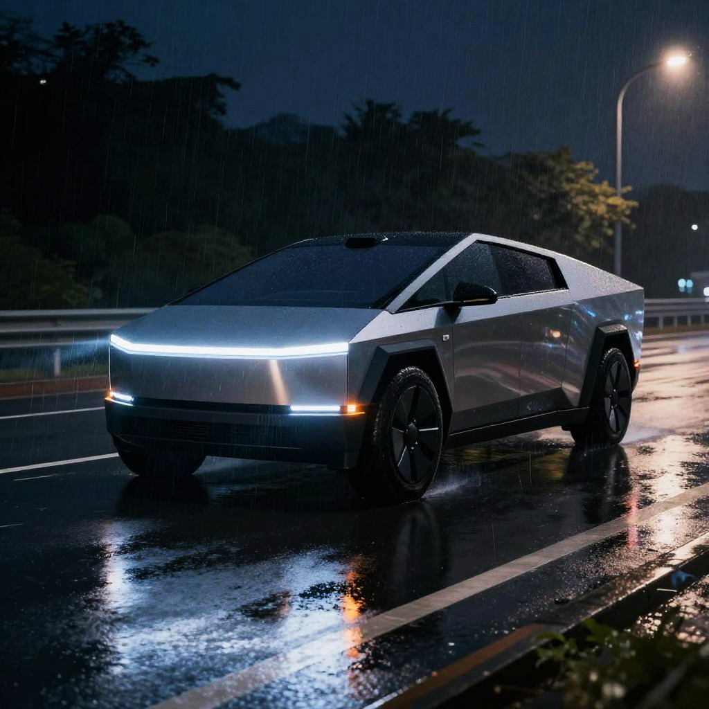 A realistic AI photo generator creating an ultra-detailed image of a futuristic vehicle on a wet highway at night, with reflective surfaces, dynamic lighting, and realistic rain effects, showcasing photorealism combined with AI-driven conceptual design.