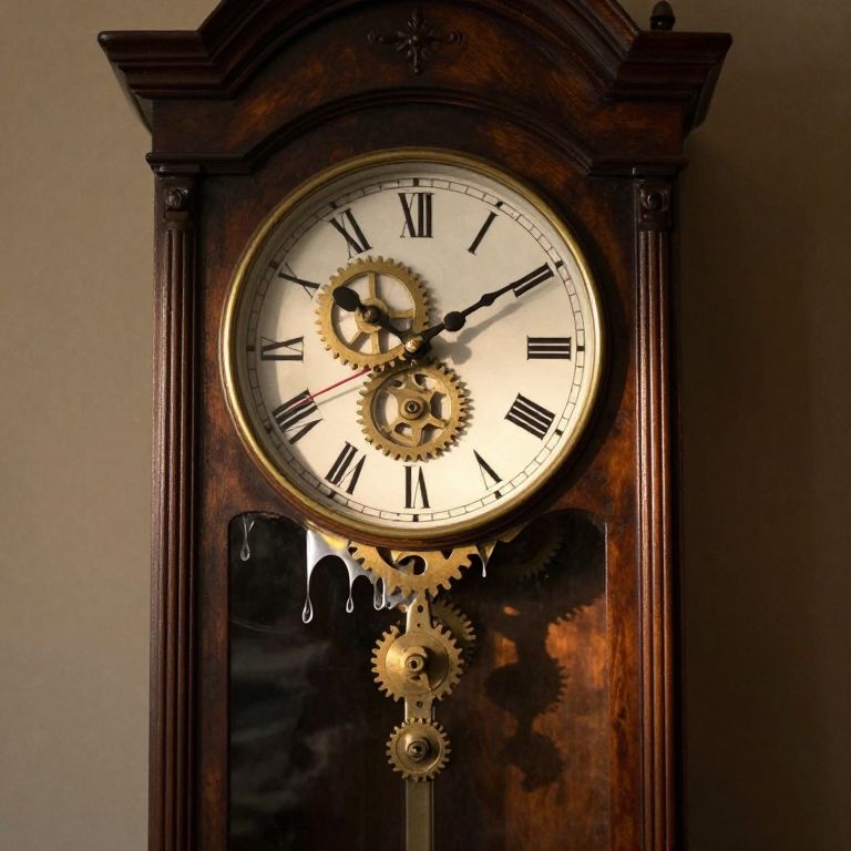 A grandfather clock with melting gears casts ticking shadows that control time in reverse, guiding people back to their past choices.