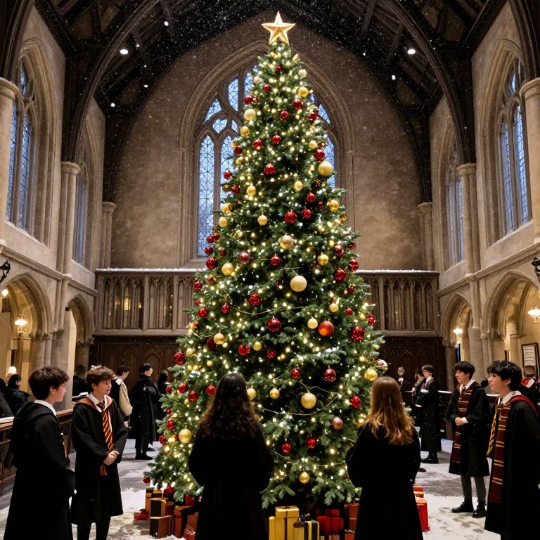 A festive scene in Hogwarts, featuring a large Christmas tree adorned with ornaments and surrounded by students in the Great Hall, with snow falling outside the windows.